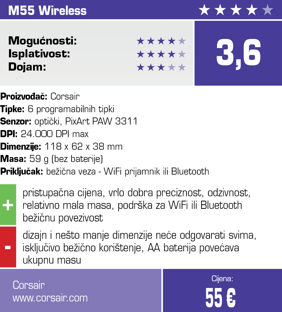 Možemo reći da testirani M55 Wireless spada u ovu kategoriju. Za nekih 55 eura dobit će kompetentno dizajniran miš poznatog proizvođača koji je pritom opremljen modernim optičkim senzorom maksimalne osjetljivosti do 24.000 DPI-ja. Međutim, ključna prednost ovog Corsairovog miša svakako je bežična veza, a pritom su vam na raspolaganju klasičan WiFi putem priloženog prijamnika ili Bluetooth.