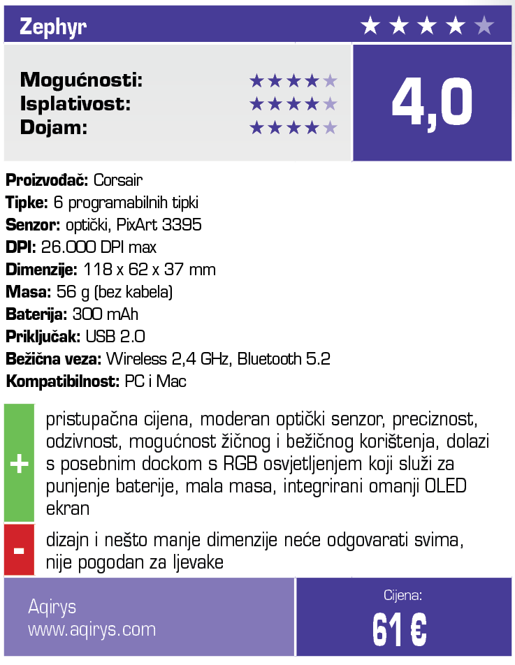Nedvojbeno je kako Aqirys sa Zephyrom donosi bogato opremljen miš odličnih mogućnosti. Sve to po vrlo povoljnoj cijeni za miš ovakve funkcionalnosti.