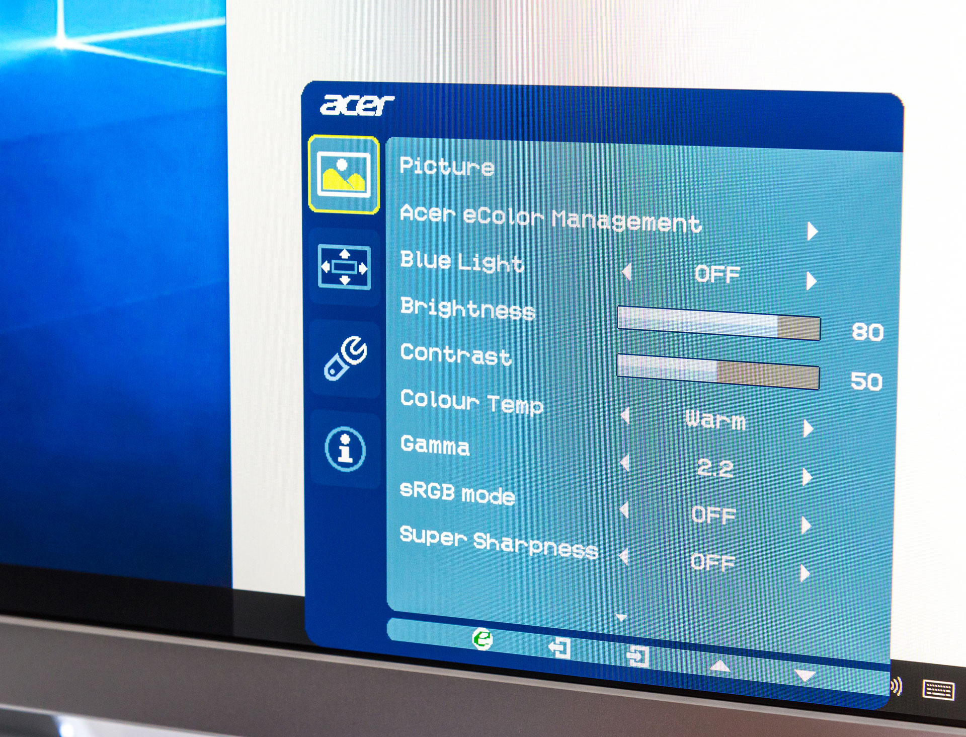 Osim power tipke, tu su još četiri namijenjene za navigaciju kroz sučelje za upravljanje slikom. Možete na početku odabrati između pet predefiniranih postavki slike: Standard, Eco, Movie, Graphic i User. Dodatno je moguće sliku podešavati kroz brightness, contrast, gamma, color temperature i sharpness postavke, ali i Blue Light opciju pri čemu se može filtrirati emisija plave svjetlosti za koju se vjeruje kako uzrokuje umor očiju. Monitor ima i naprednu korekciju boja s prilagodbom za crvenu, zelenu, plavu, žutu i magentu.