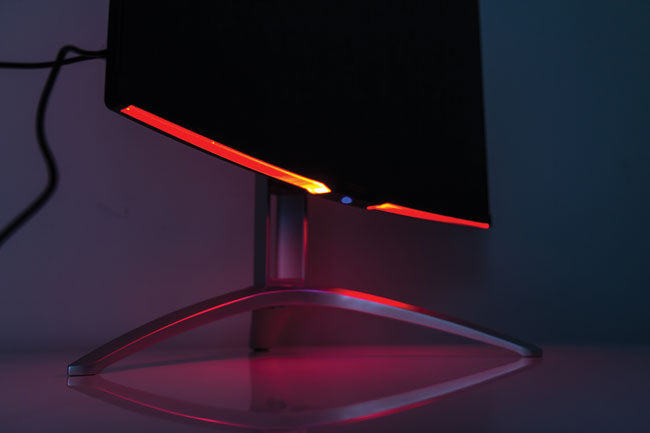 Osim podesive visine i kuta gledanja te stalka za slušalice sa strane, dizajnu pridonosi i crveno, plavo ili zeleno osvjetljenje ispod te iza ekrana, a podesivo je u tri razine. Dakle, ne radi se o RGB osvjetljenju, koje može biti višebojno, nego su dostupne samo te tri boje koje nisu interaktivne kao što je to slučaj s ambijentalnim osvjetljenjem na nekim TV uređajima, no nadamo se kako će i ta interaktivnost biti pridodana sljedećoj generaciji AOC gaming linija monitora. Ovako računalni stol osvijetljen zelenom bojom izgleda vrlo cool.