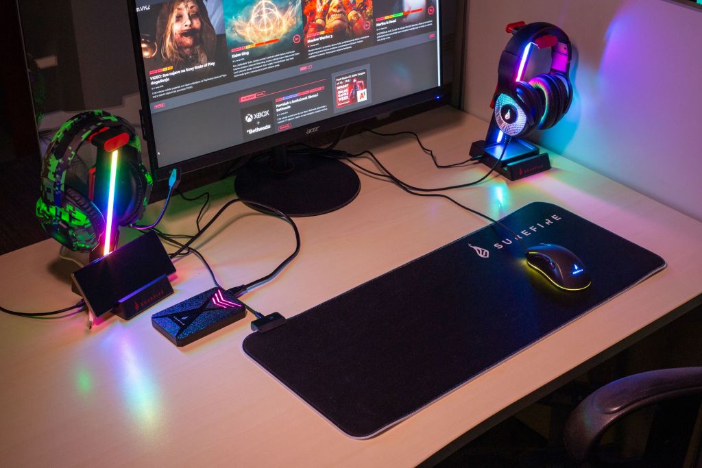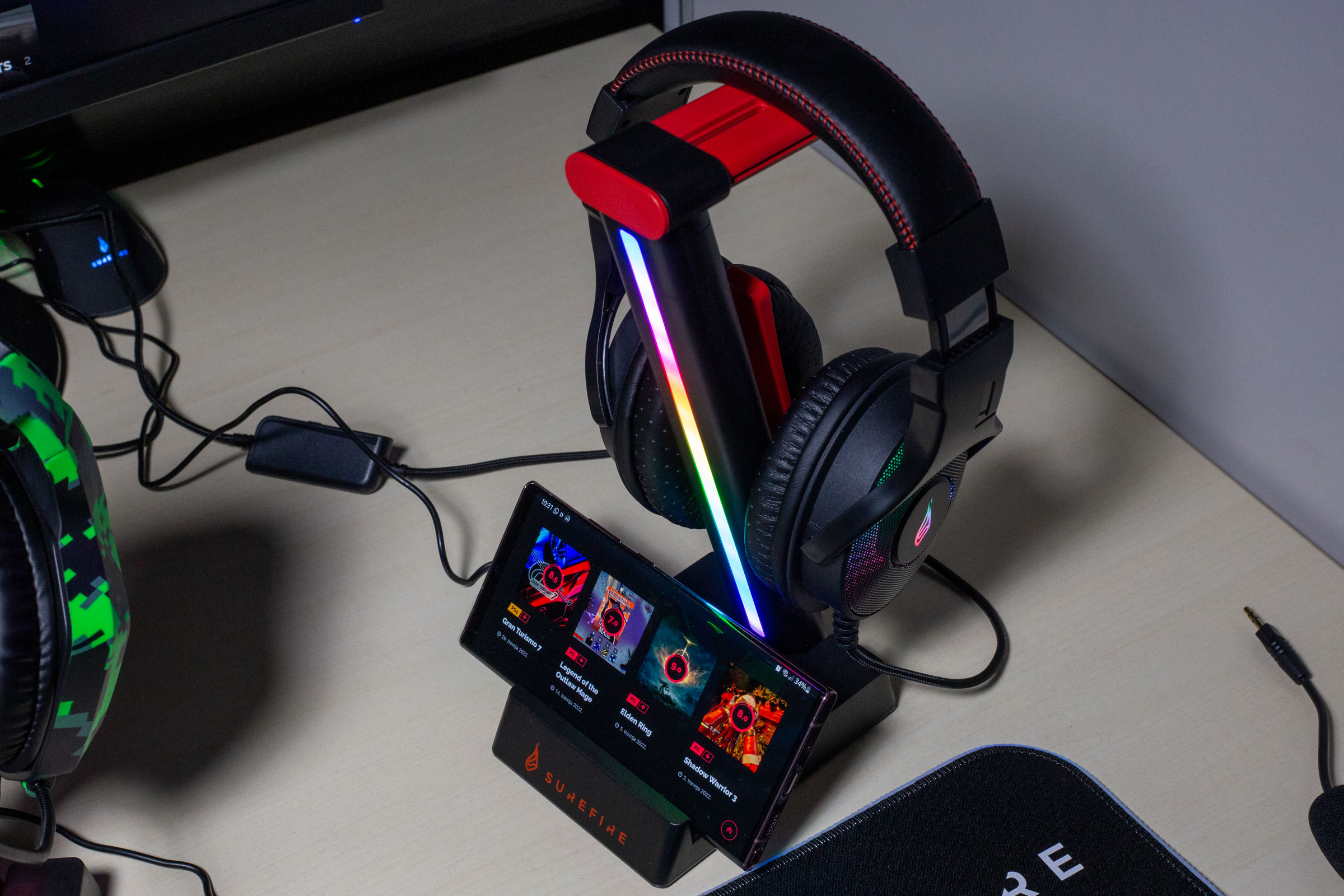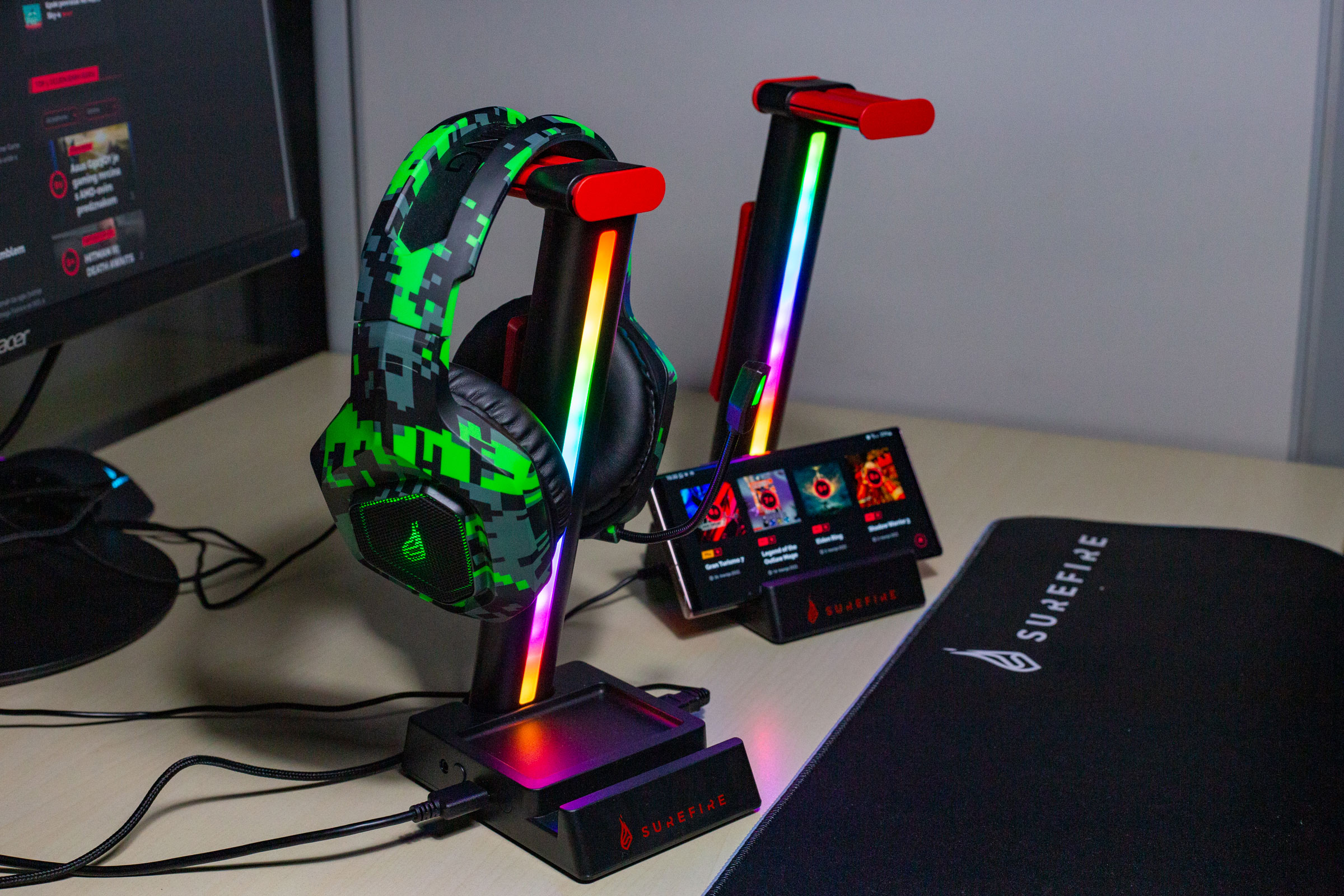 Već smo spominjali da mnogi gameri danas koriste slušalice prilikom igranja. Kako biste slušalice prije i nakon igre imali gdje odložiti, bez da vam stvaraju nered na stolu, dobro će vam doći stalak za slušalice. Surefire vam nudi dva vrlo atraktivna modela stalka za slušalice Vinson N1 i Vinson N2. Riječ je o uvlačivim stalcima za do dva kompleta slušalica koji su dostupni u crnoj i crvenoj boji, posjeduju RGB osvjetljenje, imaju funkciju pohrane kabela i ugrađeni stalak za telefon, a možete ih pričvrstiti iznad ili ispod stola. Vinson N2 model dolazi s posebno korisnim USB hubom koji uključuje tri dodatna USB priključka za lako spajanje željenih uređaja, kao i s 3,5 mm audio priključkom.