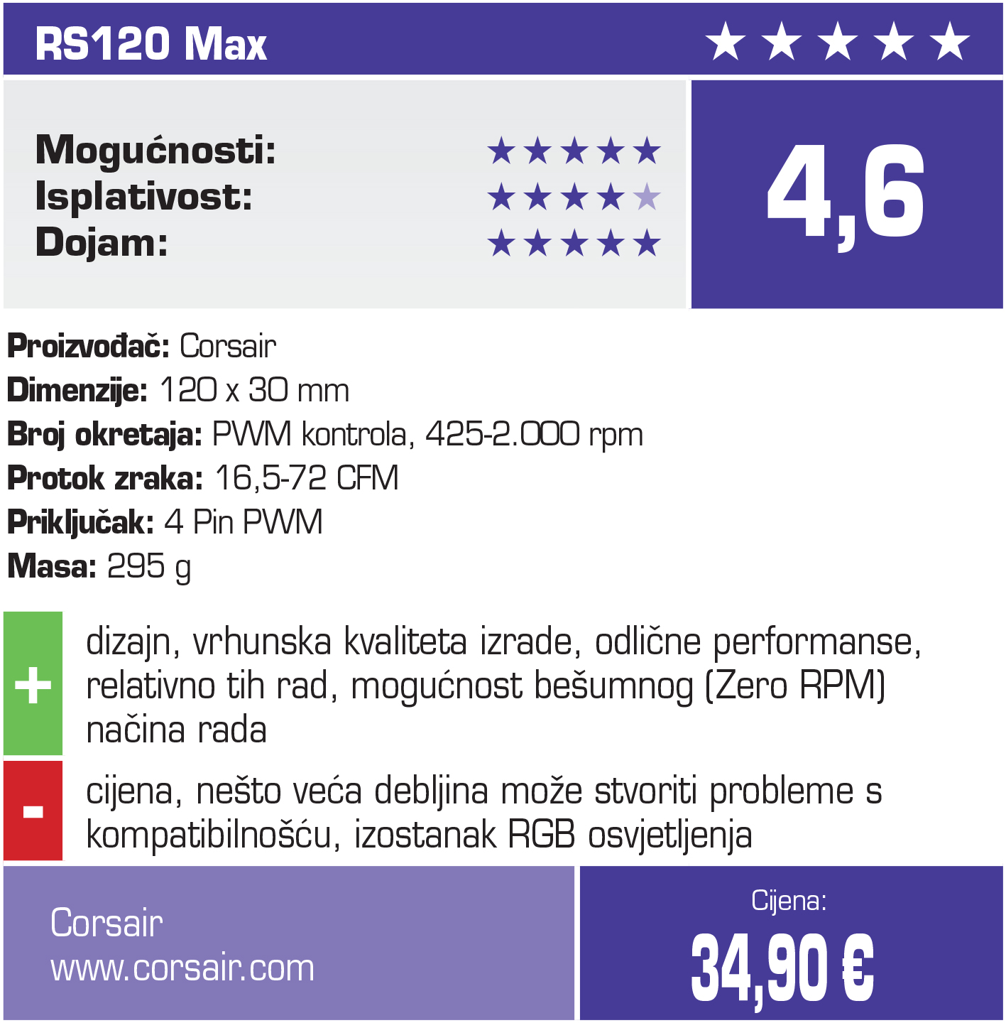 Najnoviju generaciju Corsair ventilatora odlikuje napredni dizajn koji omogućuje ponajbolje performanse i efikasnost prilikom hlađenja uz istovremeno velik protok zraka, visok statički tlak i relativno tih rad. Corsair je za izradu koristio LCP (Liquid Crystal Polymer) materijale koji omogućuju iznimno čvrstu konstrukciju i smanjuju vibracije. Također, za razliku od gotovo svih ostalih ventilatora, RS120 Max serija je debljine 30 mm, dakle 5 mm više od standardne, što omogućuje bolji protok zraka i efikasnije hlađenje.