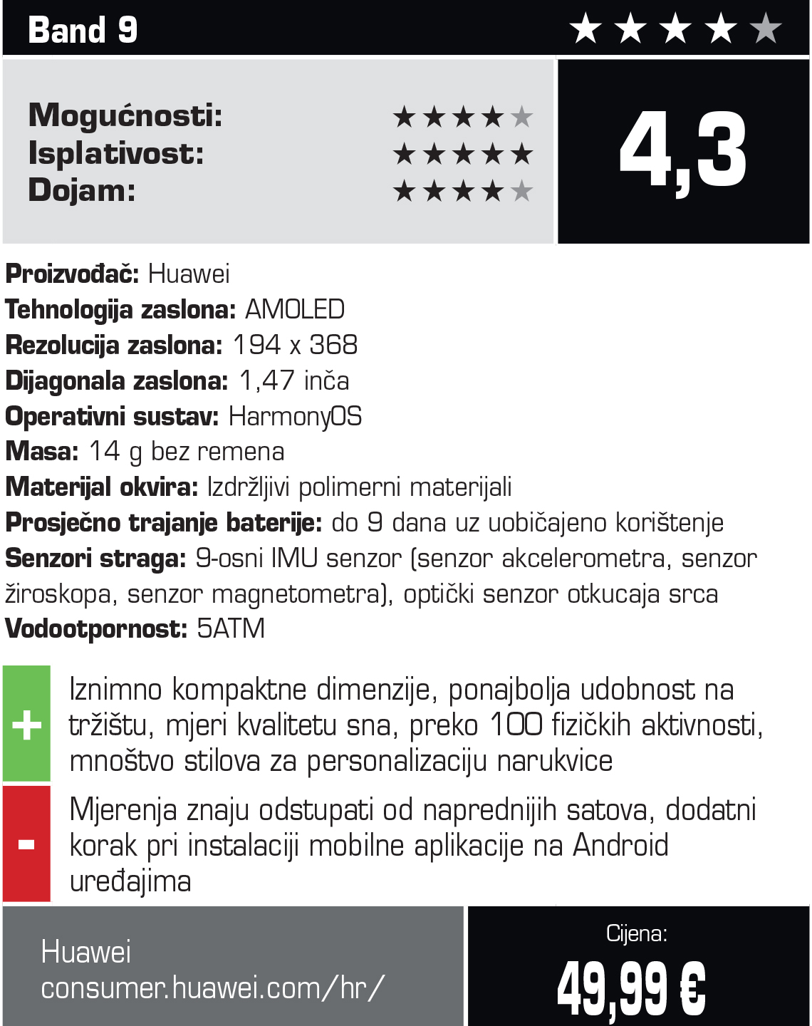 Ovim putem također ponavljamo da niti narukvice ni pametni satovi nisu medicinski uređaji koje trebate uzimati kao legitimne mjerne instrumente. Oni su nam smjernica kamo trebamo krenuti s radom na našem zdravlju, sportskim rezultatima i optimizacijom načina života koja uvelike utječe na ranije dvije stavke – tu prvenstveno mislimo na kvalitetu sna. Dok satove iz našeg usporednog testa preporučamo nešto naprednijim korisnicima, Huawei Band 9 i druge narukvice bit će jako dobro rješenje za početnike i one koji traže osnovnije podatke bez pretjeranog ulaska u dubinu tematike.