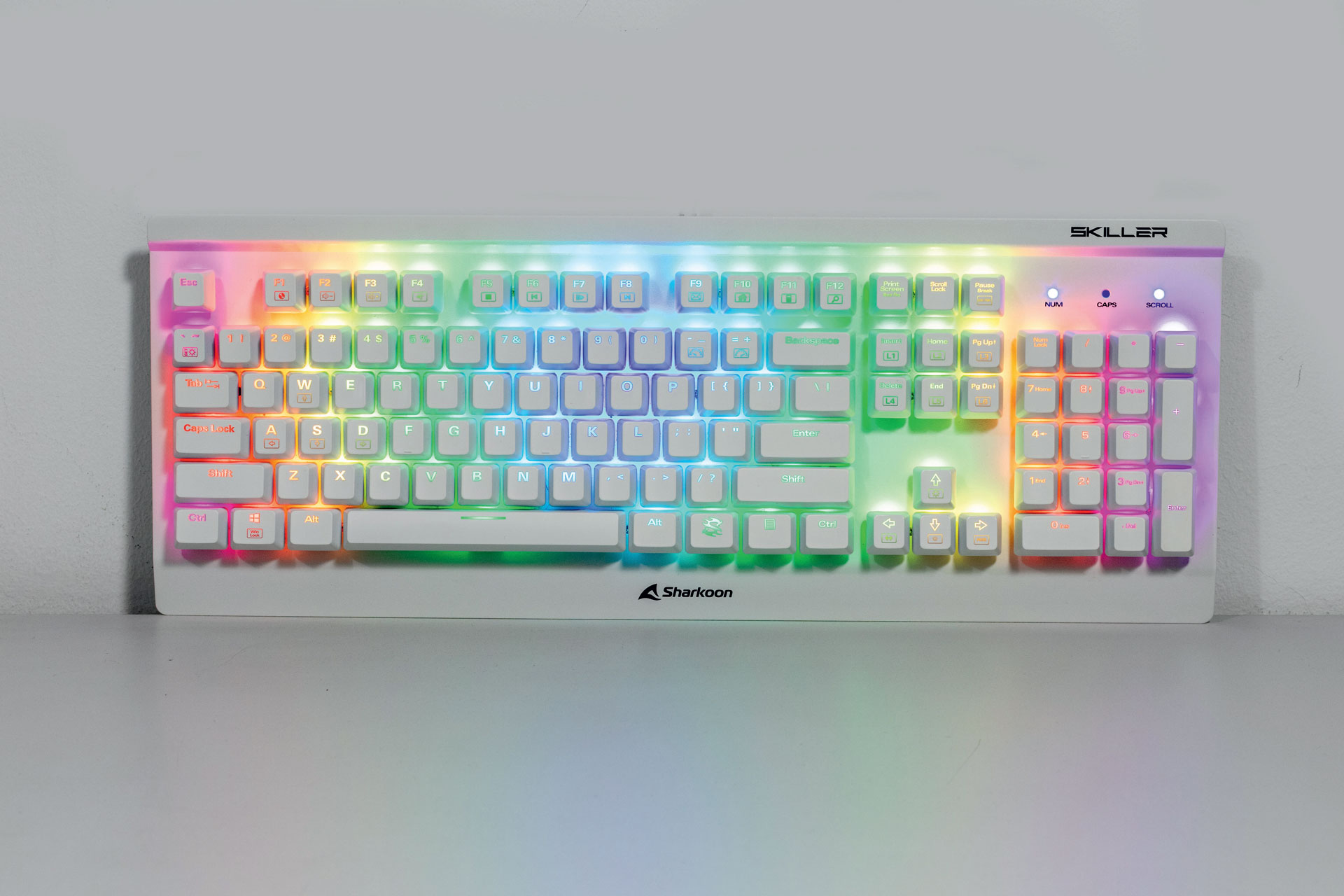 Ponovno se vraćajući na cijenu, tipkovnica nema dodatnih medijskih tipki iako možete lagano kontrolirati multimediju sa Fn verzijama funkcijskih tipki. Imajte na umu da je umjesto Fn oznake Sharkoon ubacio svoj logo, no funkcija ostaje ista. Tako dolazimo i do RGB osvjetljenja koje je na ovom modelu vrlo upadljivo zahvaljujući refleksiji od podloge.
