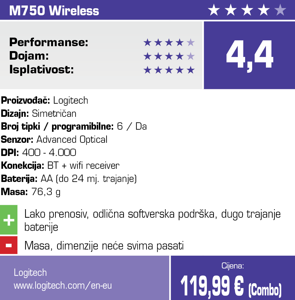 Ovo je malen miš, jednostavan za nošenje, a lako ga možemo zamisliti u torbi s laptopom. Osim solidnog optičkog senzora i DPI gumba koji omogućuju brzo prilagođavanje poslovima, od korištenja više monitora, do pomicanja po nekoliko piksela kod editiranja fotografija. Koristi AA bateriju koju valja mijenjati, no zato će kao i tipkovnica imati vrlo dug rad između zamjene baterije. Kotačić za scrollanje definitivno je iznad standardnih miševa, radi vrlo tiho, a kod bržih pokreta lako prijeđe više stranica Worda ili weba odjednom.