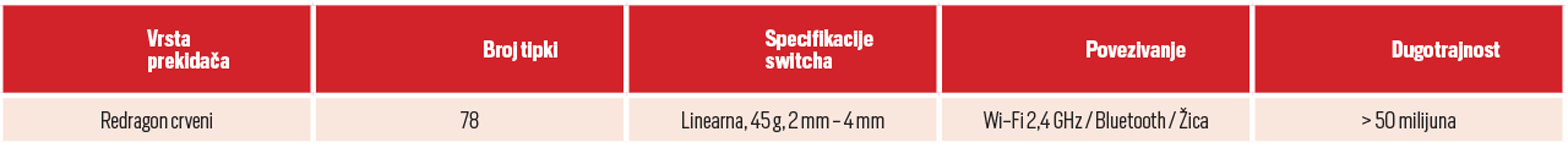 Tipkovnica koristi standardne crvene linearne BOX switcheve sa „+“ dizajnom držača i dodatnim pravokutnim ojačanjem za manje ljuljanja samih tipki. Koristi se standardan dizajn, pa je tipkovnica nešto viša, no gumbi su lagano utisnuti u kućište te je i dalje nama bilo lako koristiti tipkovnicu dulje vrijeme bez potpore za zglobove.