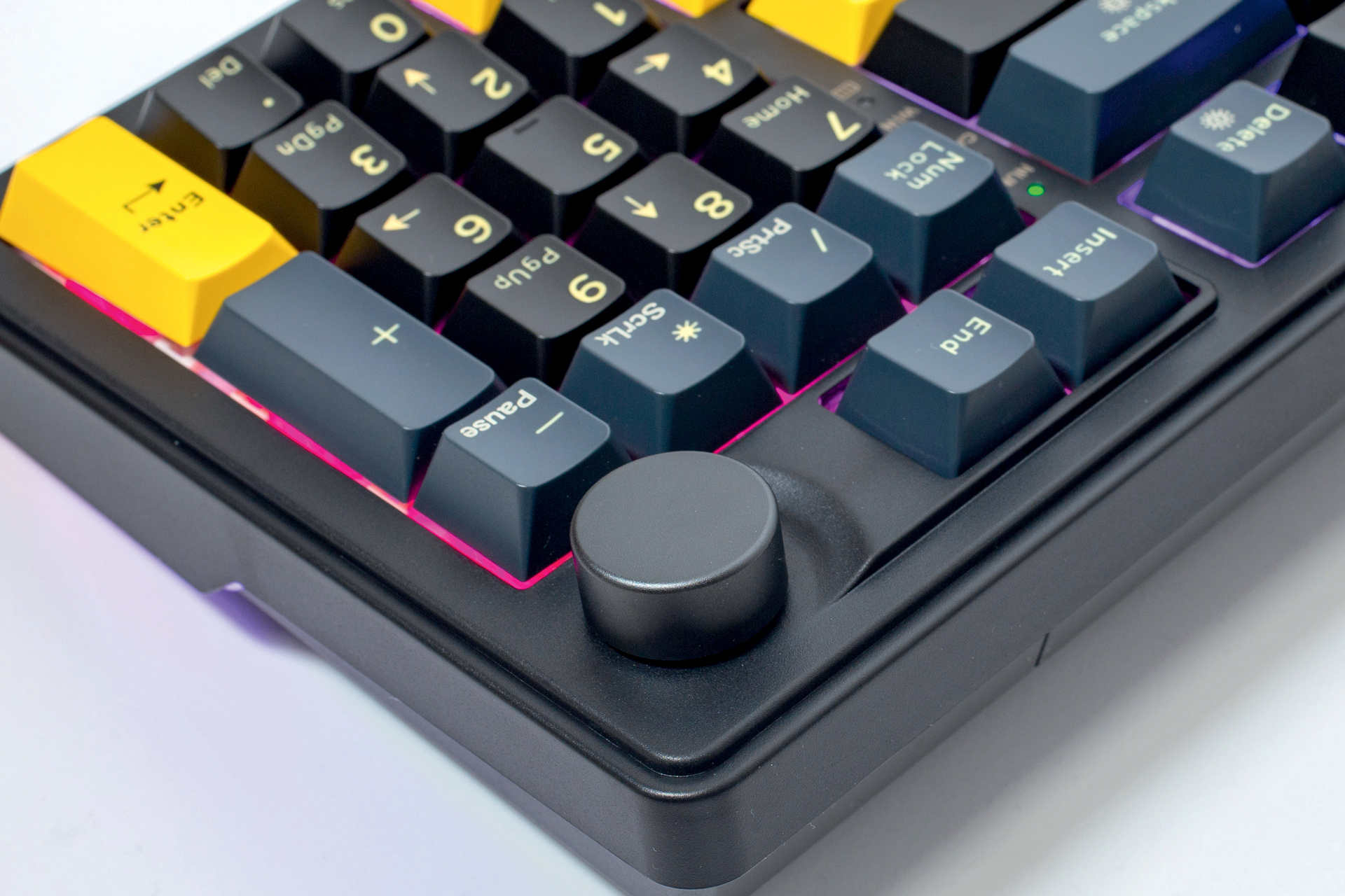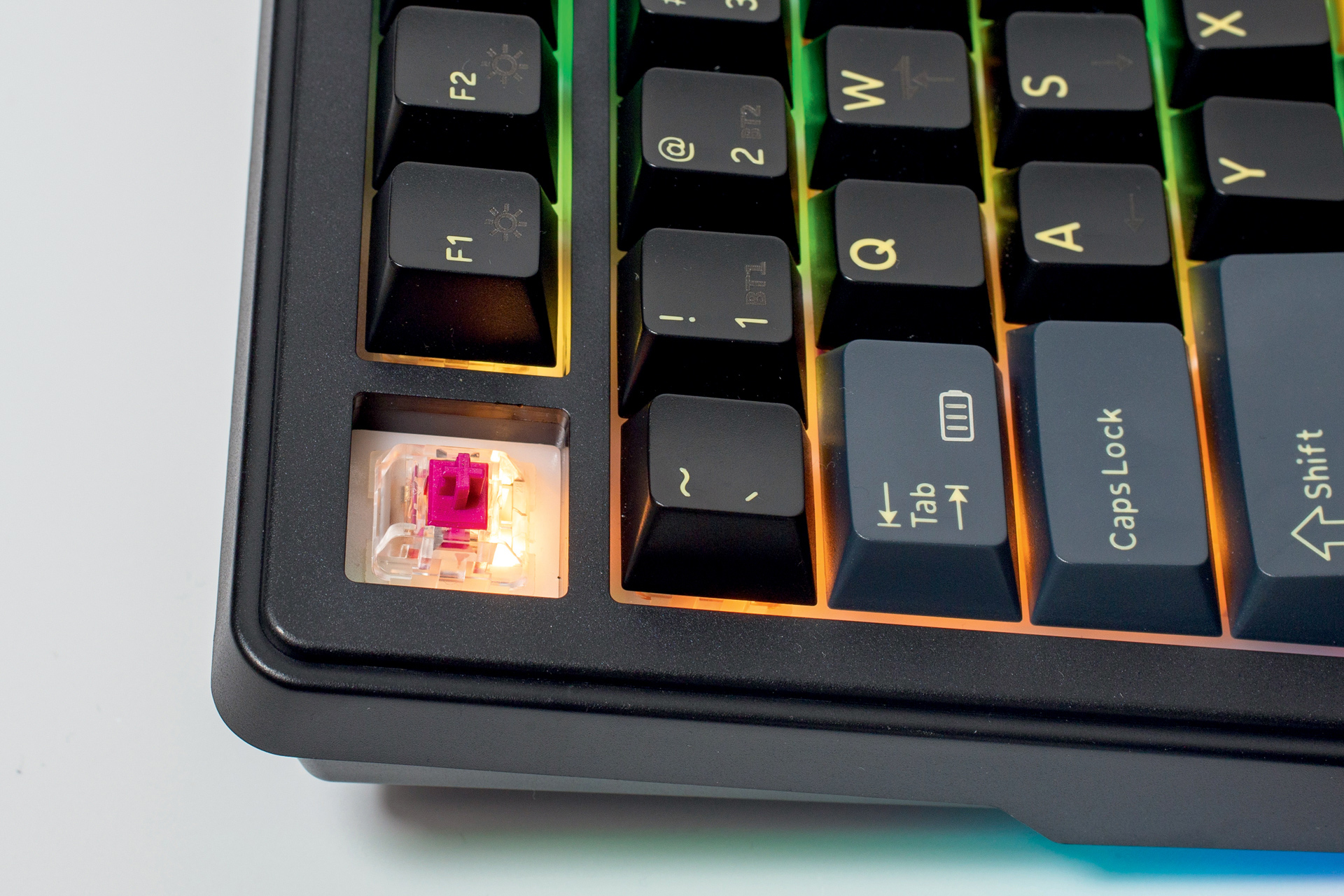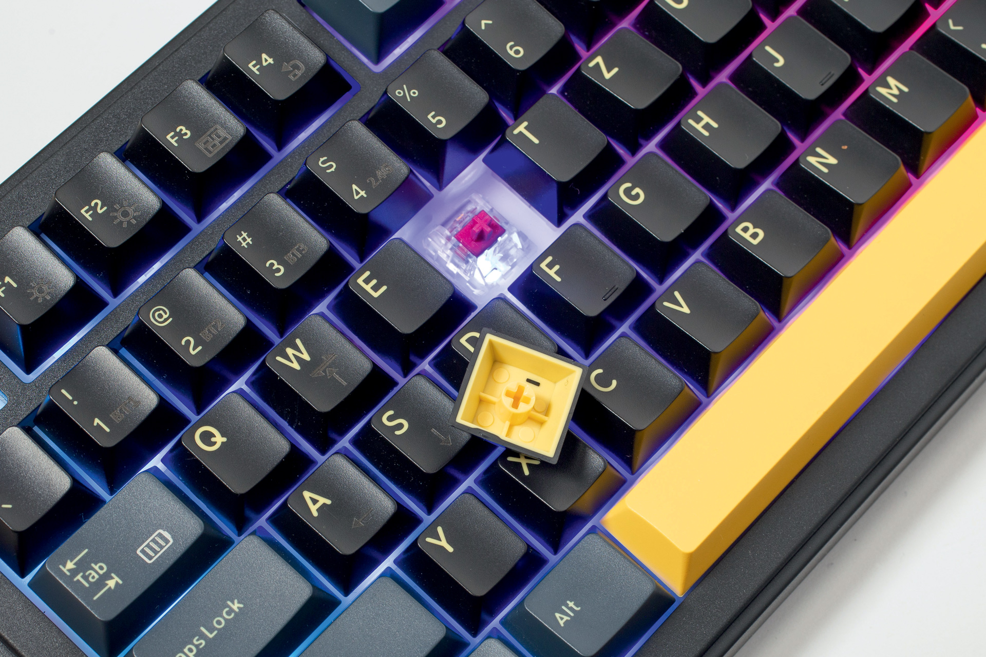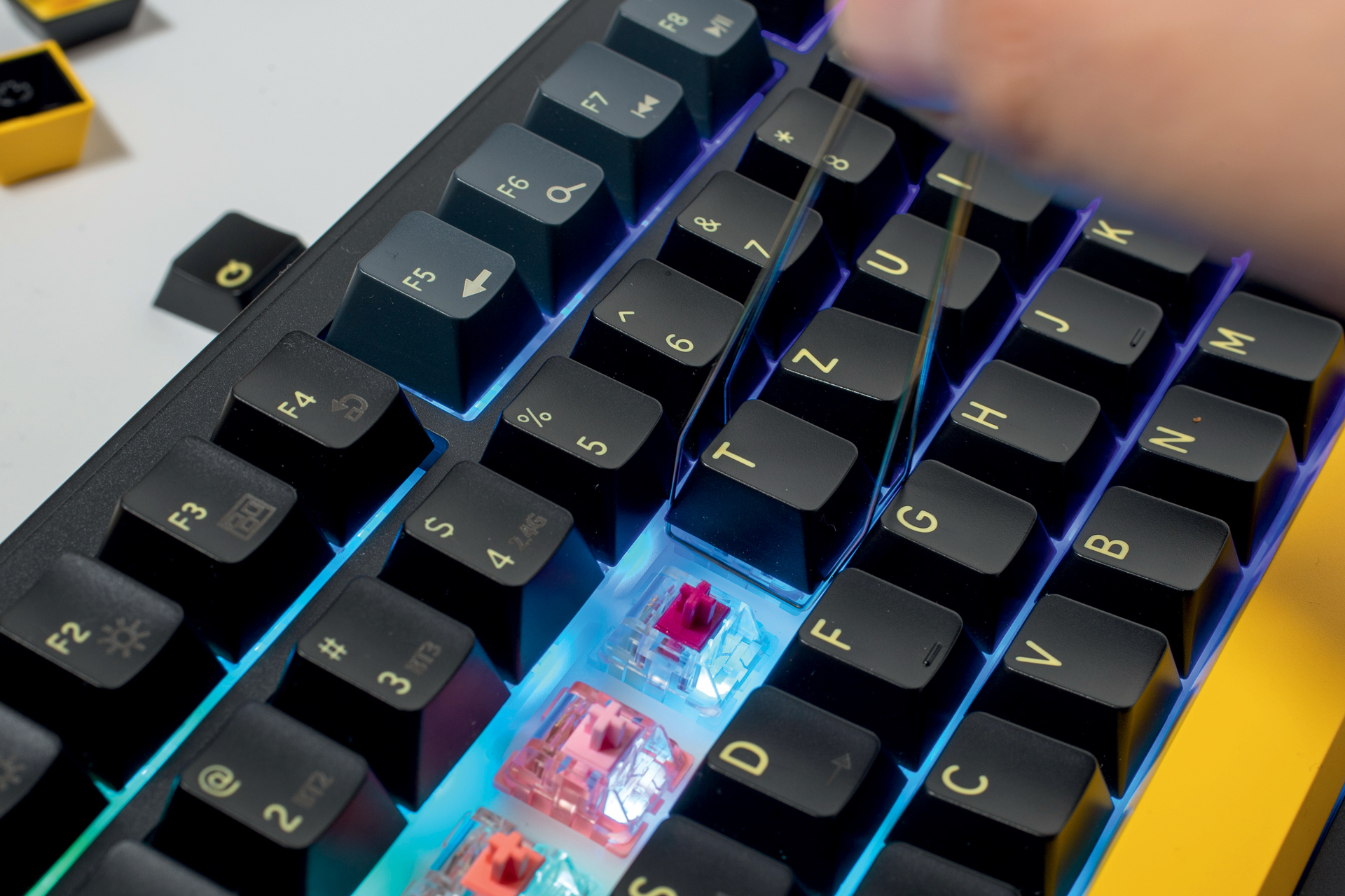 Double-shot keycaps koriste dva spojena sloja plastike kako bi se slova na tipkama očuvala bez obzira koliko godina ih koristili, a također daje žute detalje tipkovnici