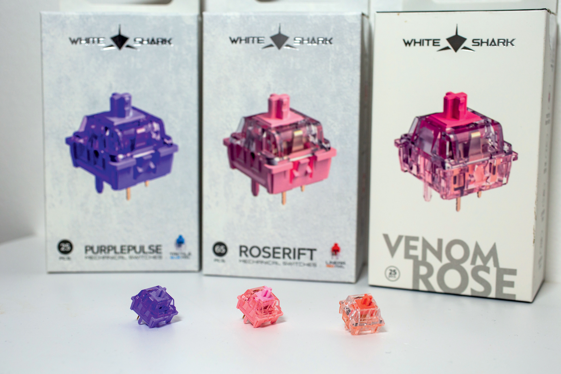 White Shark nudi tri verzije zamjenskih switcheva, od kojih su ljubičasti kliktavog dizajna, dok su dvije vrste rozih linearnog dizajna