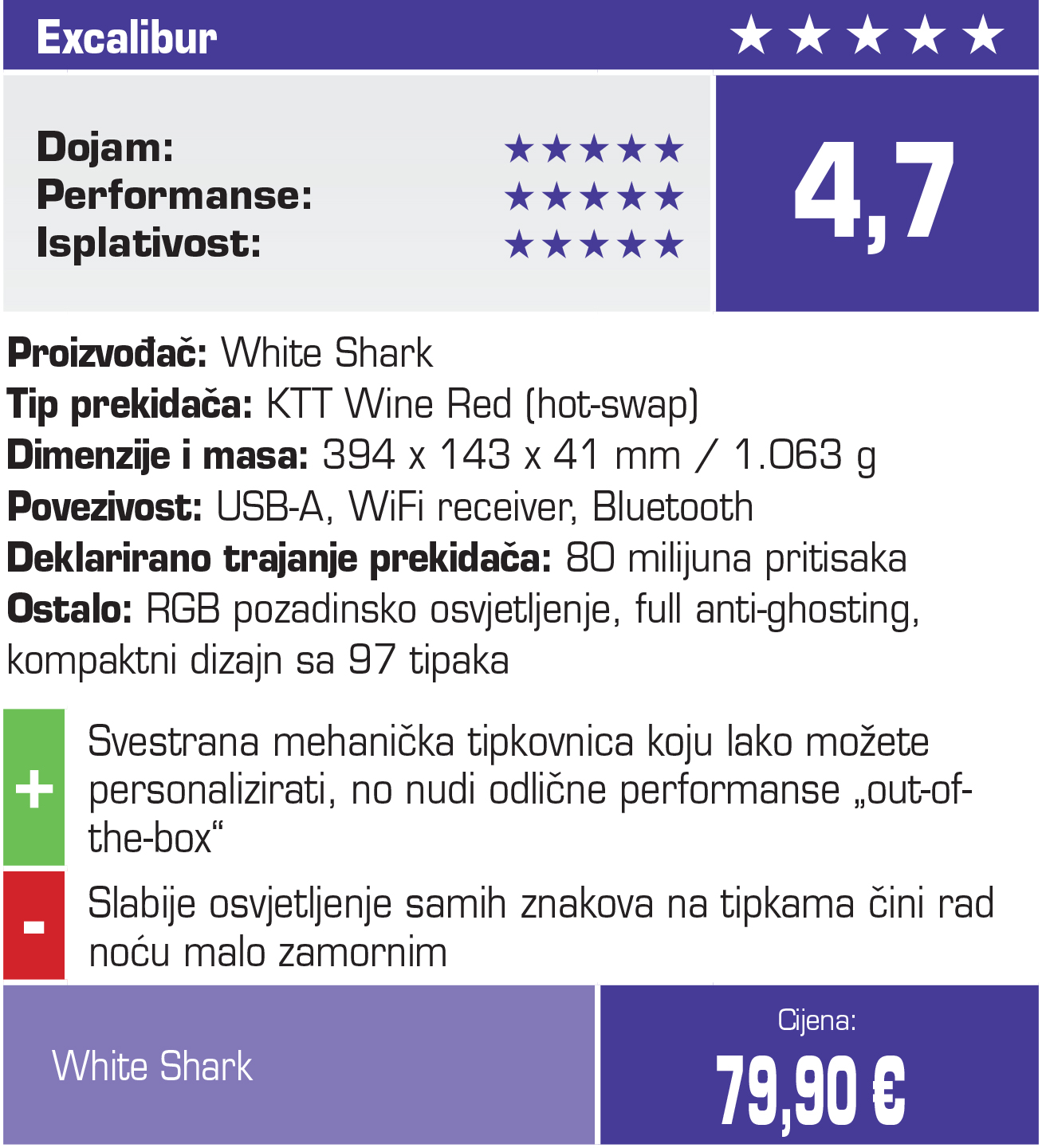 White Shark vjerojatno ne trebamo predstavljati, no isto ne vrijedi i za njihovu novu premium tipkovnicu Excalibur. Put povratka mehaničkih tipkovnica bio je skup i trnovit, no danas možete dobiti uistinu odličan model po vrlo atraktivnoj cijeni. Dapače, ono što dobivate mnogima će biti „samo“ odlična tipkovnica, no za pokojeg korisnika, ovo može biti pravi raj za eksperimentiranje i personalizaciju periferije, koja postaje svojevrsno središte vašeg setupa. Krenimo tako od osnovnih specifikacija.