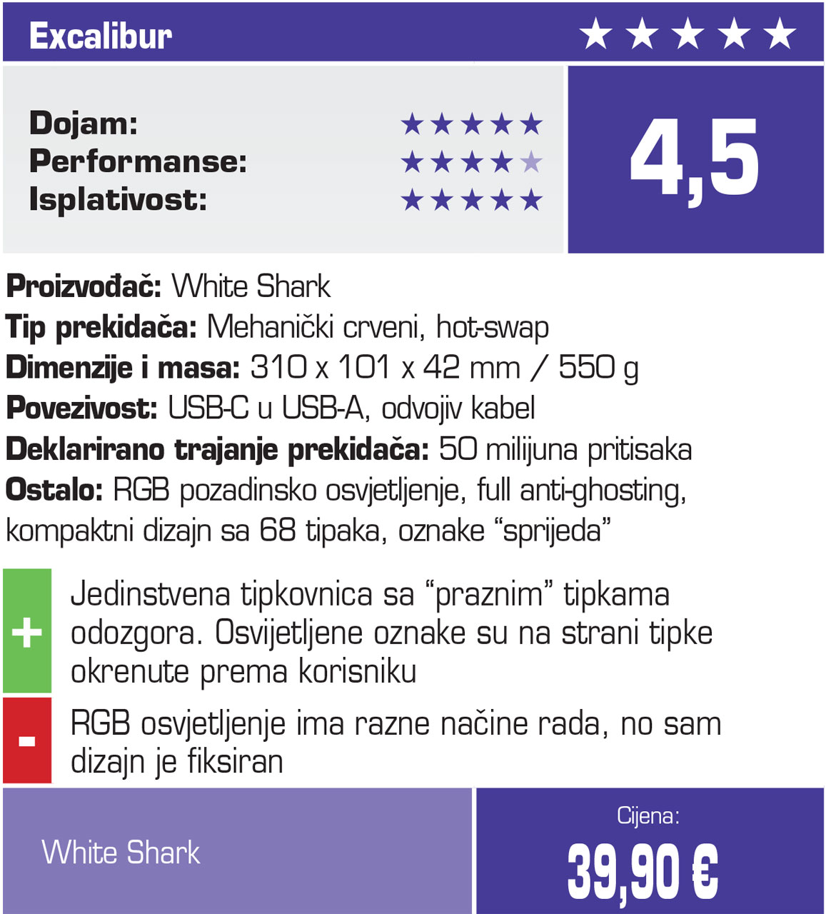 Tipkovnica nema problema sa ghostingom, a također koristi maksimalnih 1000 Hz pooling preko USB-a kablom. Dok linearni switchevi imaju životni vijek od oko 50 milijuna pritisaka, podržan je hot-swap za druge switcheve, što vam nudi i dodatne aftermarket opcije za personalizaciju dijela ili cijele tipkovnice sa drugim switchevima. Imajte na umu da tipkovnica ima standardnu visinu za mehaničke modele, a s računalom se povezuje odvojivim opletenim kablom. U svakom slučaju, nudi se po iznimno atraktivnoj cijeni s obzirom na specifikacije, a donosi i jedinstven dizajn vašem setupu.