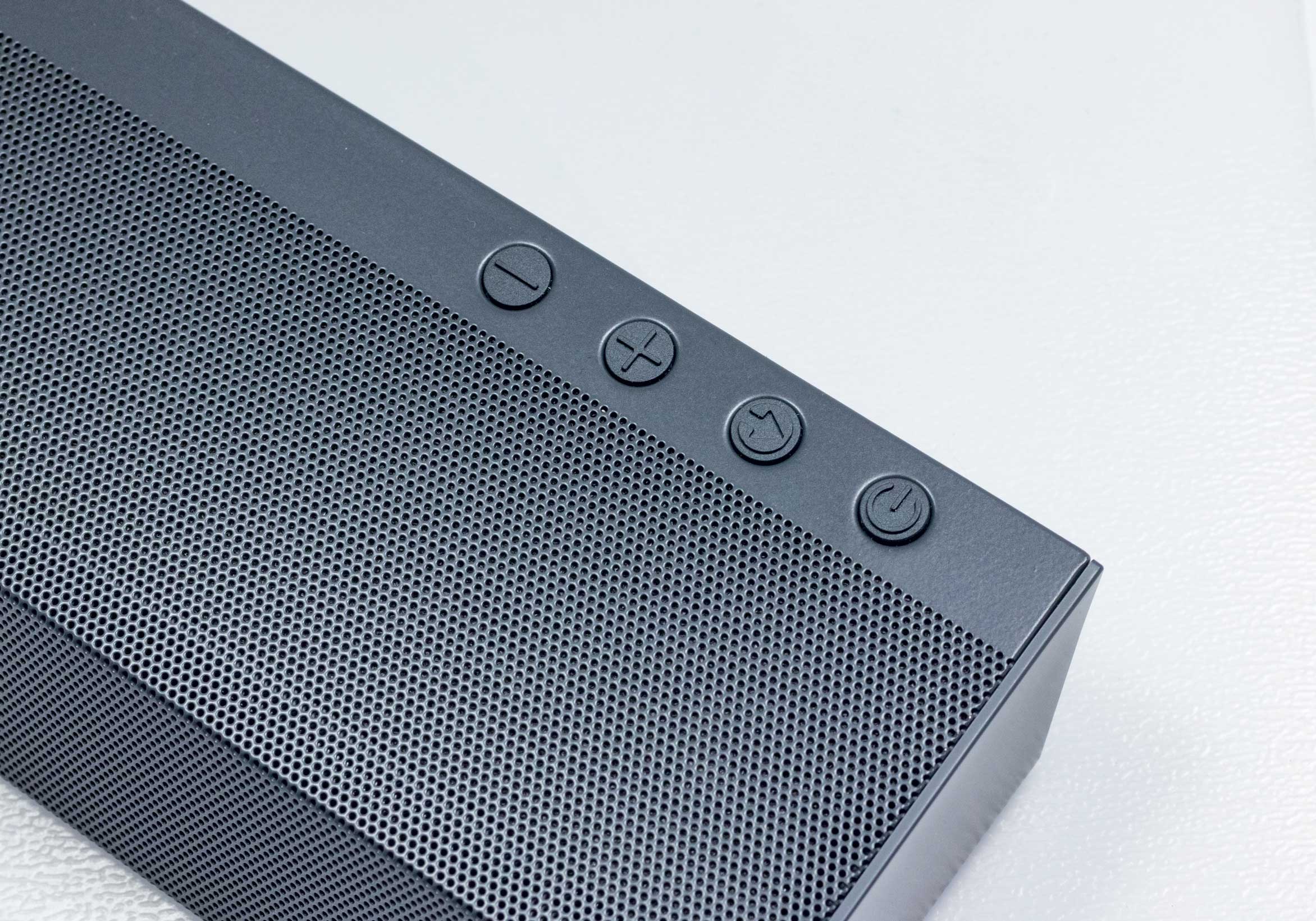 Na krovu soundbara u desnom kutu nalazi se i pet gumbi koji omogućuju laganu osnovnu kontrolu bez daljinskog upravljača te imaju standardne mogućnosti poput kontrole glasnoće ili izvora. Stražnja strana nema vidljivih utora, no jasno se vide uvučeni dijelovi koji ih skrivaju. Kada soundbar okrenete, vidjet ćete i sve mogućnosti povezivanja. Naravno, tu je utor za napajanje. Soundbar koristi vanjsko napajanje te ovdje spojite njegov konektor. Osim napajanja, tu je još i mogućnost spajanja digitalno s izvorom pomoću optičkog kabela. Dok on garantira najbolju kvalitetu prijenosa signala, nemate pristup svim funkcijama sustava. Kako biste imali sve funkcije, savjetujemo da soundbar povežete pomoću HDMI kabla. Na televizoru ciljate na ARC izlaz, koji je i namijenjen da se spoji sa zvučnicima te omogućuje kontrolu vanjskih zvučnika i televizora jednim daljinskim upravljačem. Imate opciju spajanja i USB-a, a tu je i Bluetooth receiver kako biste se mogli direktno povezati s mobitelom i tako puštati glazbu.