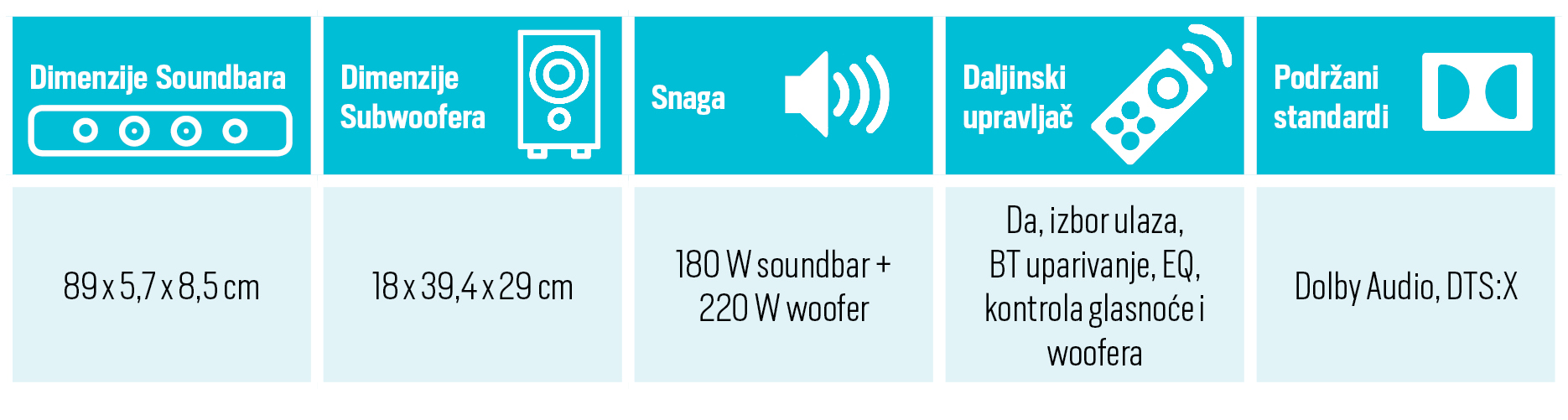 Sami soundbar ima dvokanalni sustav, a svaki se kanal sastoji od dva zvučnika: jednog visokotonca te jednog ovalnog woofera za širu reprodukciju zvuka. Maksimalna snaga soundbara je 90 W za svaki kanal, plus 220 W za dubokotonca, što ukupno čini 400 W snage – solidno za veće prostorije i glasnije slušanje glazbe. U sredini soundbara, ispod prednje rešetke, nalazi se mali zaslon, koji će jasno prikazati sve postavke koje birate pomoću daljinskog upravljača te se ugasiti kada ga ne dirate kako ne bi smetao. Daljinski upravljač ima solidno organizirane gumbe, koji su dovoljno veliki da ih pogodite i u mraku.