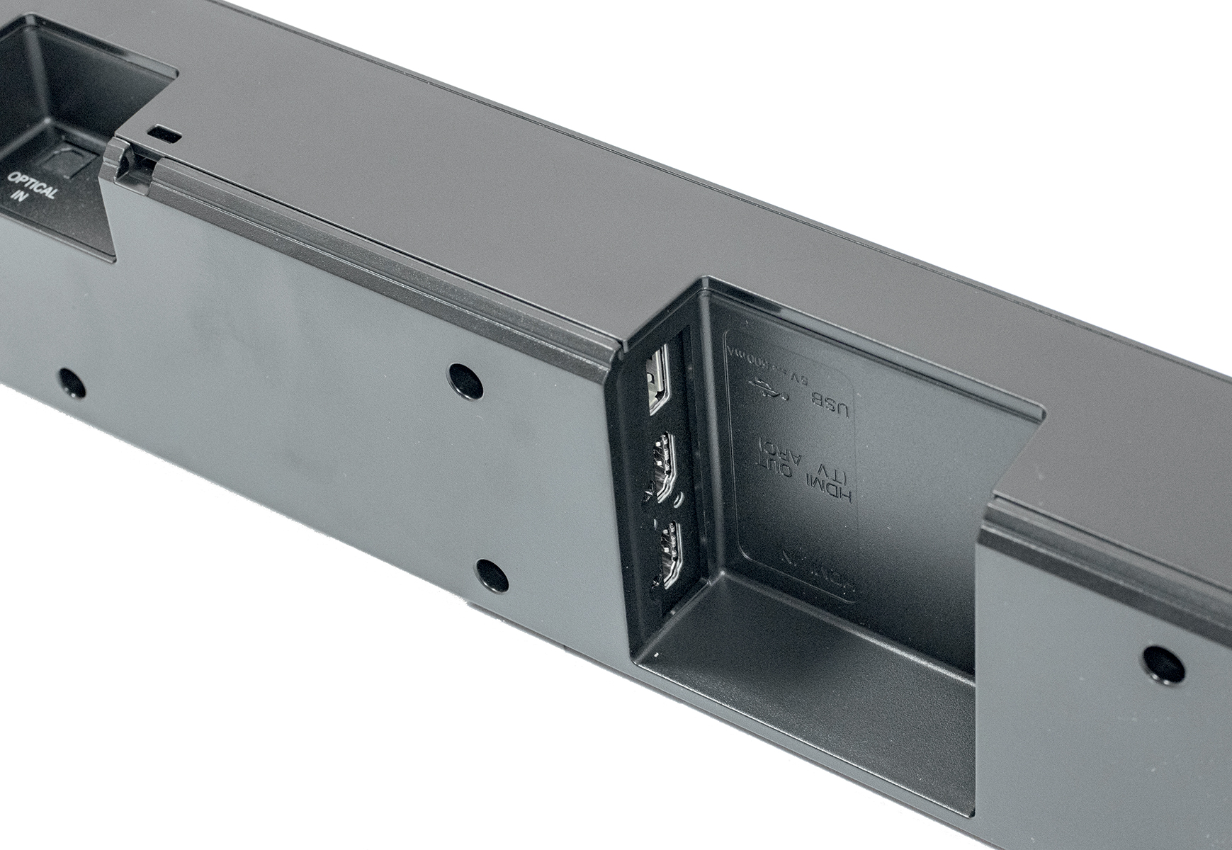 Osim logoa, isprva nećete primijetiti mnogo detalja, no na desnom rubu soundbara nalaze se gumirani gumbi za izravno upravljanje. Možete podešavati glasnoću te birati izvore zvuka, kao i uključiti sami soundbar. Straga imamo standardno skrivene sve utore, podijeljene u dva odjeljka. Za cijenu dobivate solidni set ulaza, koji uključuju HDMI passthrough, ARC podršku, digitalni optički ulaz te, naravno, Bluetooth 4.0 podršku za puštanje glazbe izravno s mobitela.