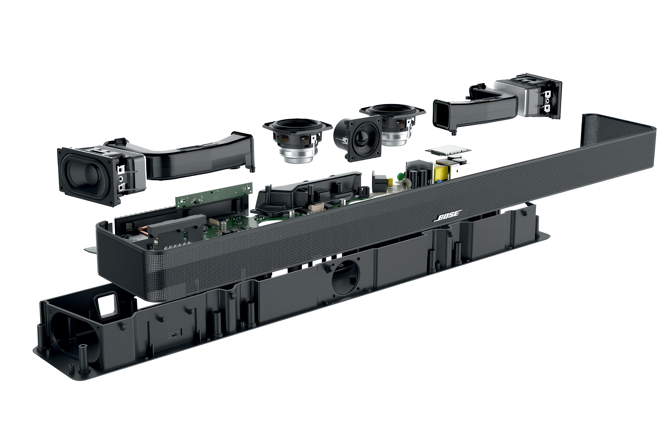 Soundbar sam po sebi koristi 3.0.2 setup. To znači da imate tri standardna kanala, dva kanala koja emitiraju zvukove prema stropu, a soundbaru nedostaje integrirani dubokotonac. To ne znači da Bose dizajnom nije pokušao optimizirati rad soundbara.