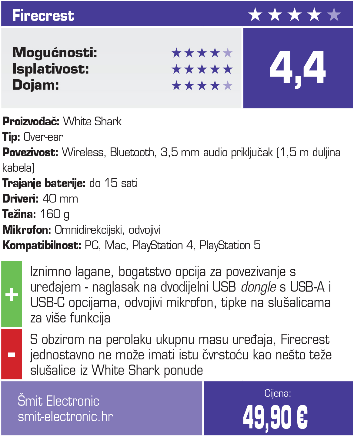 Sa svojih 160 g ukupne mase, White Shark Firecrest je među lakšim slušalicama koje smo imali priliku testirati. Pogotovo kad uzmemo u obzir činjenicu da se radi o bežičnom headsetu za gamere koji dolazi i s baterijom koja obećava vrijeme autonomije do 15 sati.