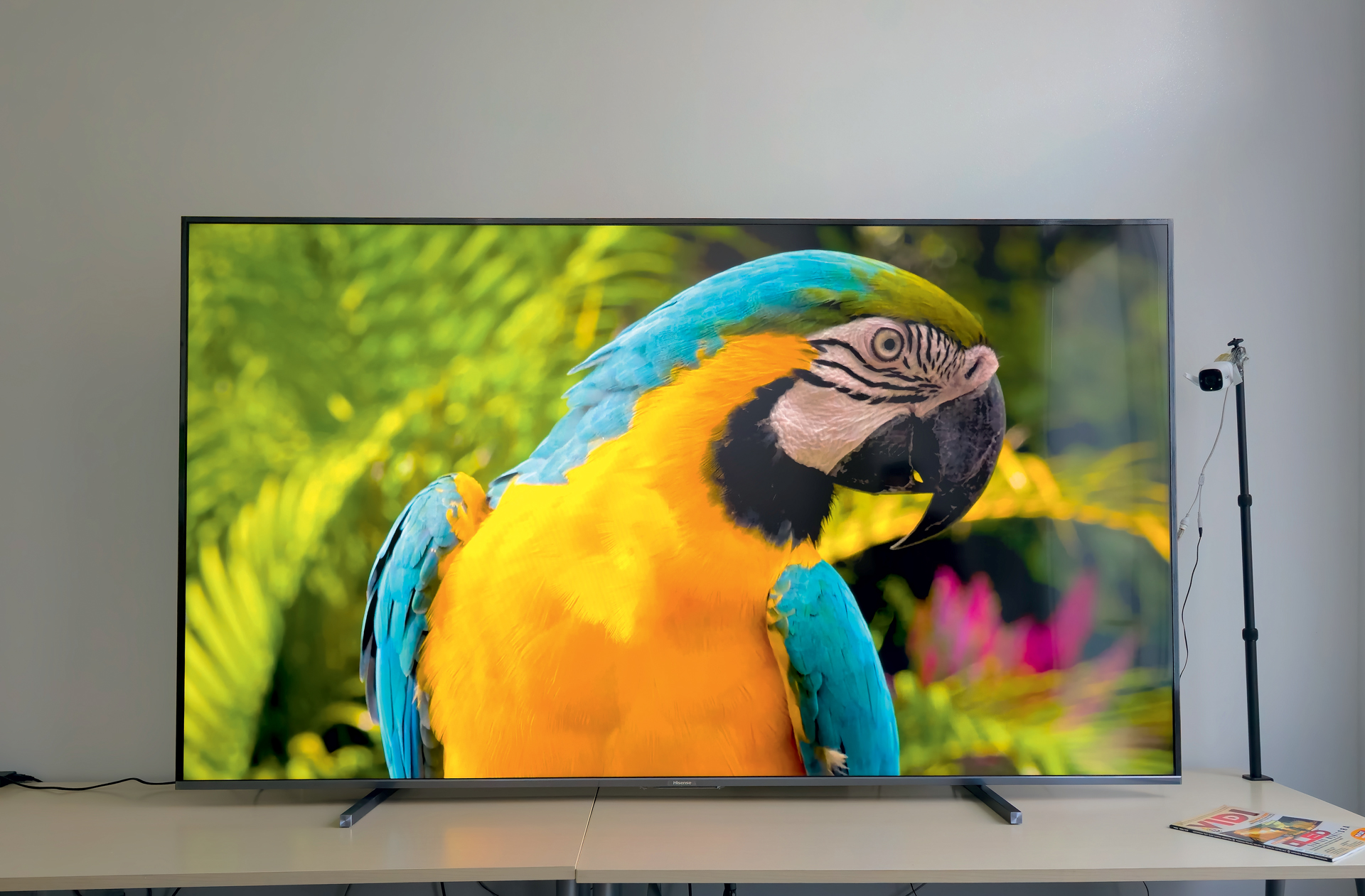 i kako vam slika ne bi djelovala „zrnato“ ako sjedite preblizu. Hisense ovdje za prikaz slike koristi modernu VA matricu uz naprednu QLED tehnologiju za bolji prikaz boja. Ukupan rezultat je slika odličnog kontrasta, iznimne dinamike i vrlo živih boja. Pozadinsko osvjetljenje se oslanja na Direct LED tehnologiju, ali uz korištenje naprednog lokalnog zatamnjenja (Full Array Local Dimming) s ukupno više od 200 zasebnih zona. U praksi ovo omogućuje vrlo respektabilnu razinu svjetline (800 nita max.) i izniman kontrast. Treba naglasiti da je uniformnost osvjetljenja iznenađujuće dobra, posebno ako uzmemo u obzir ogromnu dijagonalu.
