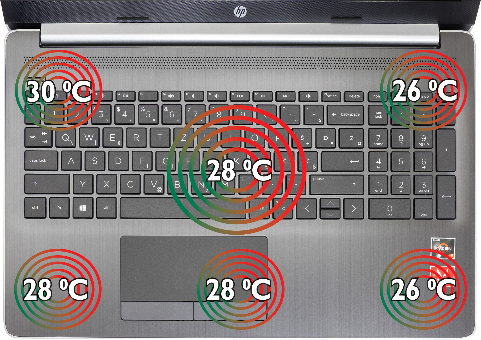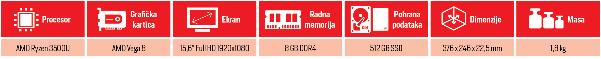 Ovaj HP-ov jeftini laptop jedini se od svih testiranih prijenosnika temelji u potpunosti na AMD-ovoj mobilnoj hardverskoj platformi koja uključuje AMD-ov četverojezgreni procesor Ryzen 3500U koji posjeduje integrirani grafički čip Vega 8.