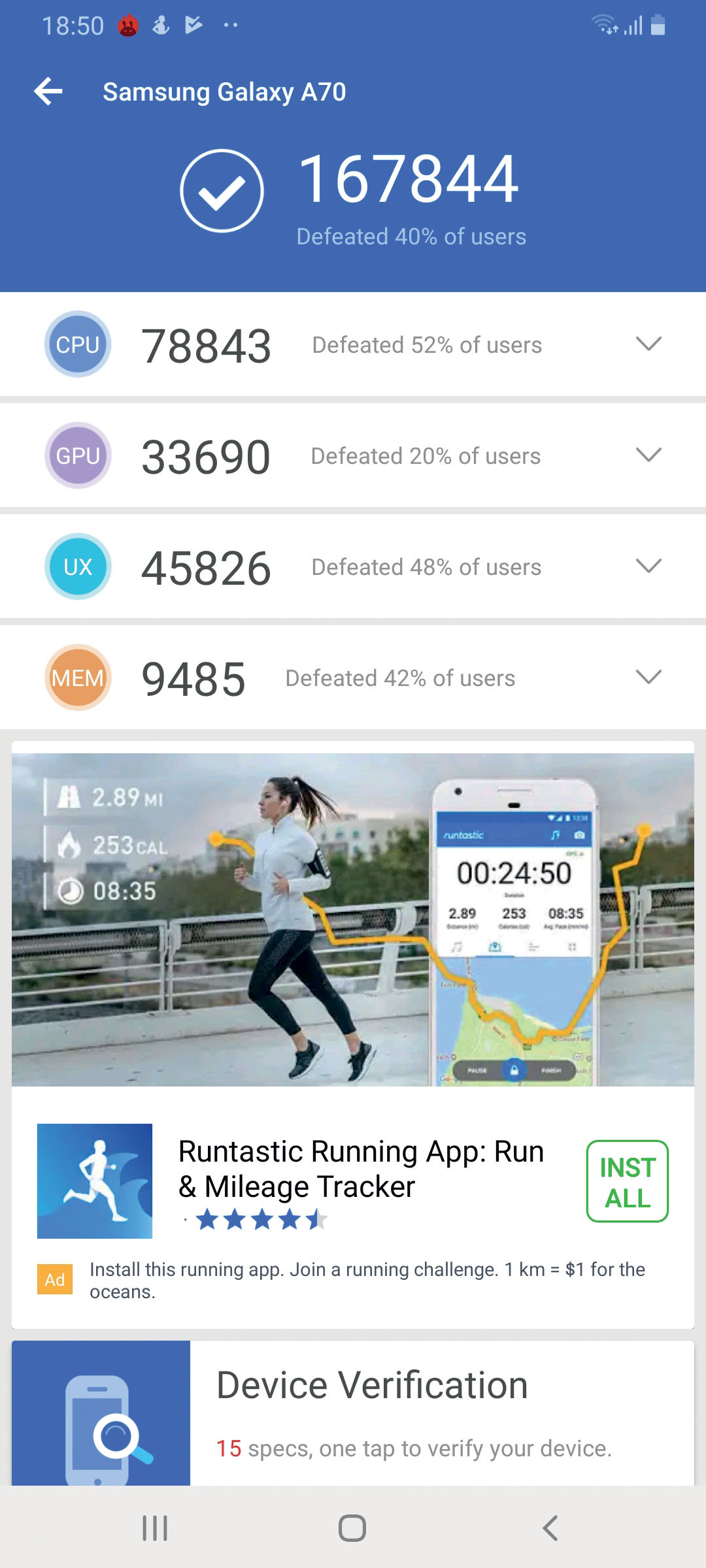 Snapdragon 675 je octa-core procesor sa šest Cortex A55 efikasnih jezgri te dvije jezgre Cortex A76, koje pružaju svu snagu koja vam je potrebna. Dok procesor nadilazi sve granice, Adreno 612 grafička kartica ne oduševljava previše. Unatoč tome, A70 solidno odrađuje svakodnevne zadatke kao što su slanje poruka, pozivi, pregledavanje društvenih mreža i višezadaćna izvedba. Možemo samo reći da je to pravi dokaz kako dobro optimizirani softver može raditi čuda. Ali kada je riječ o igrama kao što je PUBG ili Asphalt 9, moramo napomenuti da sve teče glatko samo na srednjoj grafici. Međutim, na višim postavkama grafike primijetili smo povremeno kašnjenje i telefon se malo zagrijao.