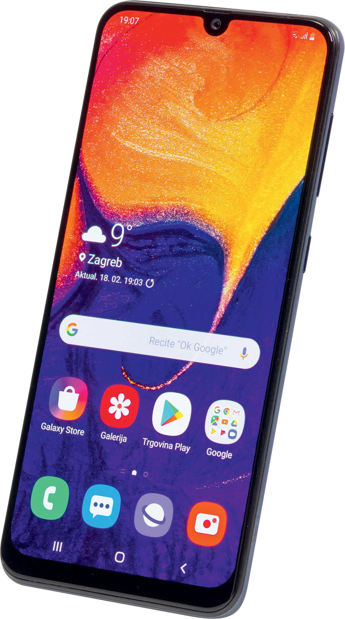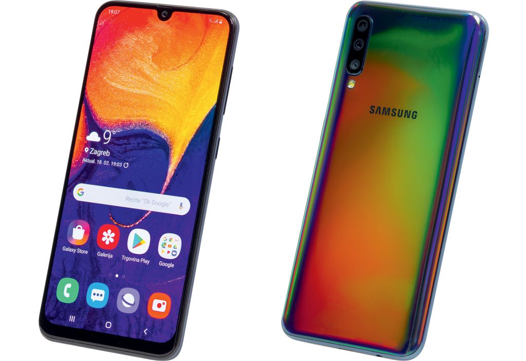 A50 nalazi se u toj atraktivnoj cijeni zajedno sa solidnim softverom koji će vas bez problema godinama držati. Sprijeda, dočekuje vas veliki 6,4 inčni zaslon. Riječ je o FullHD+ rezoluciji sa 1080x2340 piksela i Super AMOLED tehnologijom. Amoled zasloni osiguravaju apsolutnu crnu boju te su ogroman kontrast (doslovno) u usporedbi sa IPS zaslonima te također umanjuje potrošnju baterije pri radu i svakako savjetujemo “noćni” način rada koji će bijele boje sučelja zamijeniti crnima te tako pospješiti trajanje baterije.