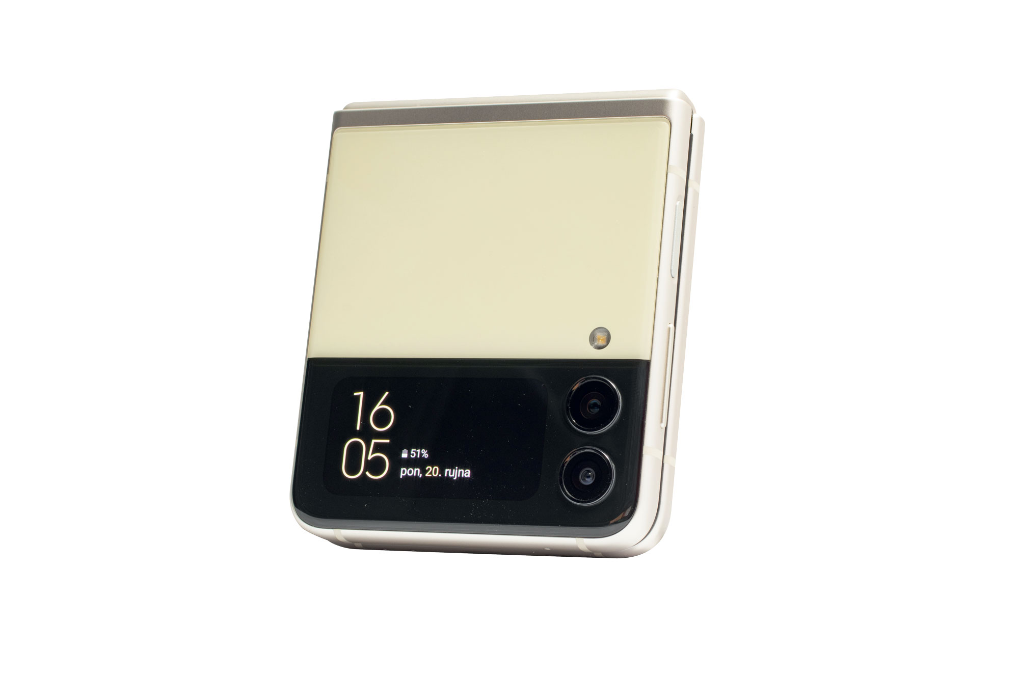 Izvana, mobitel je dobio osvježeni dizajn gdje su sjajne boje zamijenjene nešto umjerenijim pastelnim dizajnom, a mi na testu imamo Cream White verziju. Zaklopljen zadržava iste dimenzije kao i prošli, no velika razlika je značajno veći vanjski zaslon koji će vam ponuditi više podataka, od prikaza vremena do pristupa notifikacijama kao i kontrolu nad vanjskim kamerama koje u ovom modu sada mogu snimati i video. Stražnja strana nema detalja, no podržava brzo bežično punjenje kao i reverse wireless charging drugih uređaja. Vanjske polovice mobitela koriste najnovije Gorilla Glass Victus staklo otporno na lom i grebanje. Spomenimo i da su glavne kamere straga iste kao i do sada, s 12 MP senzorom na glavnoj širokokutnoj, kao i na sekundarnoj ultraširokokutnoj kameri. Kako kamere ne bi previše stršile van kućišta koriste se manji senzori pa performanse neće biti na razini klasičnih mobitela u ovom cjenovnom rangu. Podržano je snimanje 4K @ 60 fps videa stražnjom kamerom, ali i prednjom, zahvaljujući 10 MP selfie kameri koja je jednakih performansi kao i kod ostatka flagship Galaxy ponude tako da ćete moći u potpunosti iskoristiti mogućnosti ovog mobitela s obzirom na mogućnost presavijanja. Mobitel se dijeli na dva dijela koja su povezana impresivnom šarkom te AMOLED savitljivom zaslonom.
