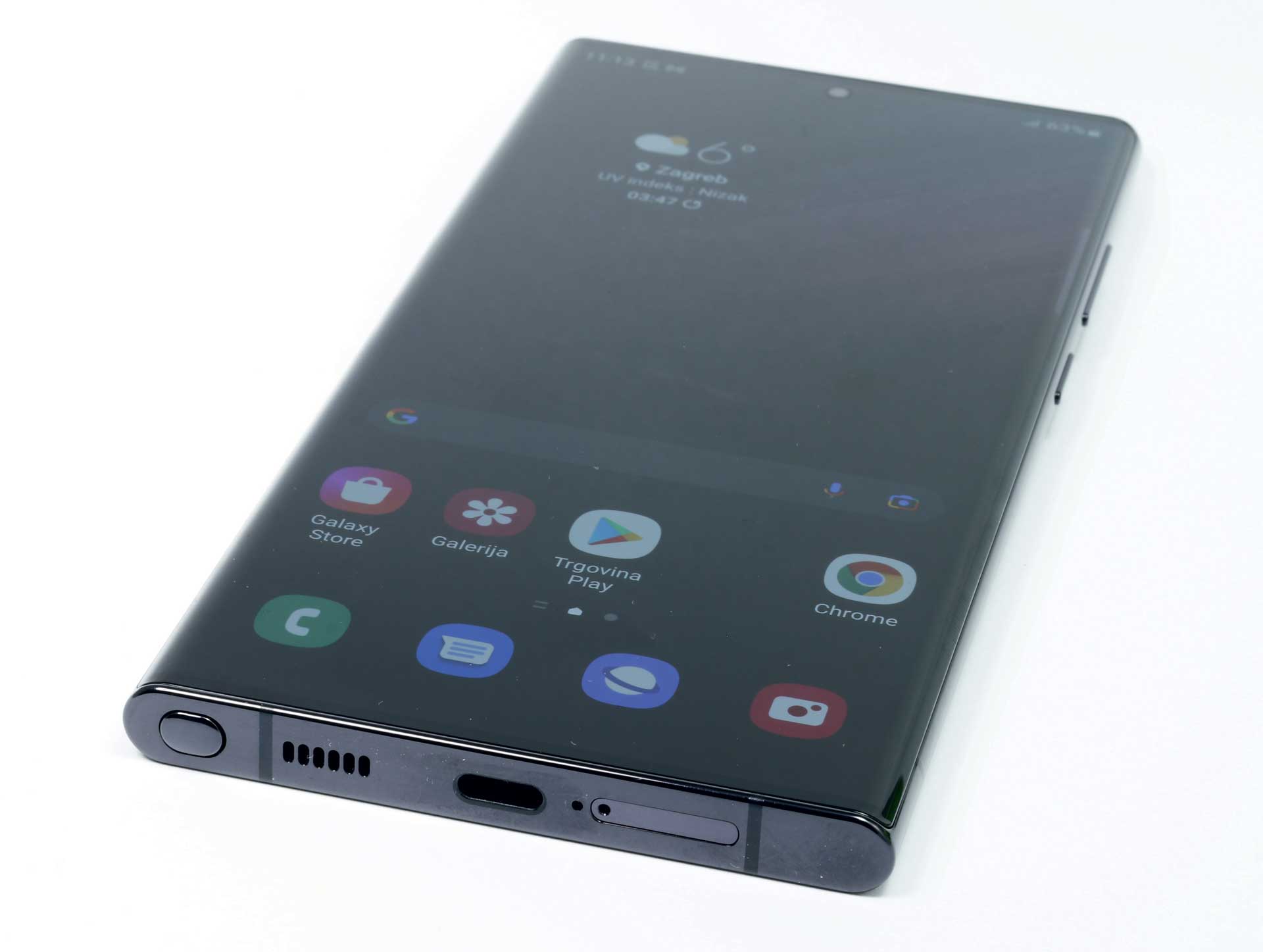 Na vrhu zaslona je i dalje sitna rupica s kamerom, a iznad nje sitni prorez uz sam rub sa zvučnikom za pozive koji sada već standardno radi i u stereo postavci za multimediju. Okvir oko mobitela je od aluminija, uključujući i gumbe za kontrolu glasnoće te zaključavanje s desne strane mobitela. Na vrhu imamo samo rupicu s mikrofonom, dok su na dnu USB-C utor, zvučnik te novi S Pen koji ovaj mobitel čini nasljednikom Note serije.