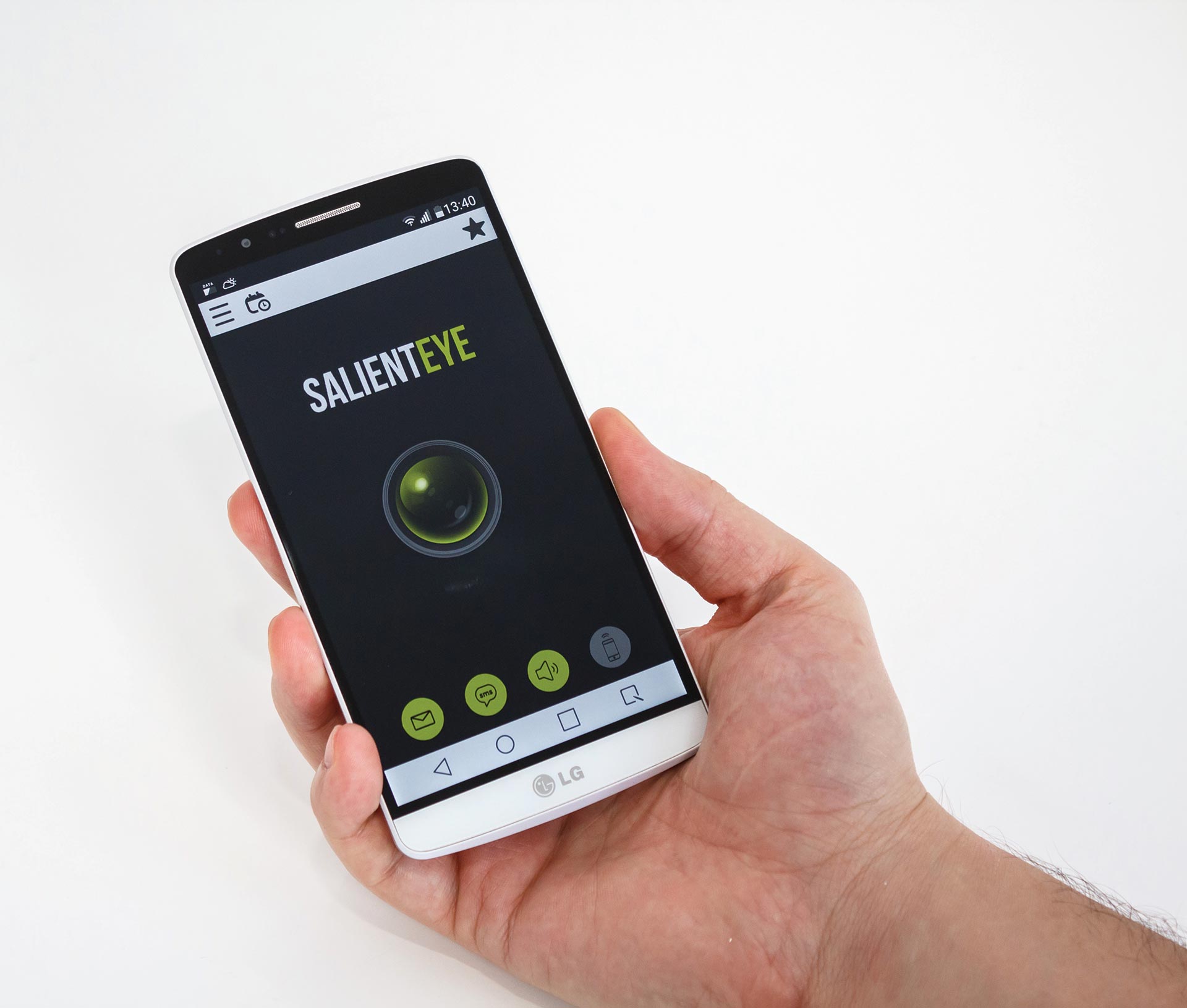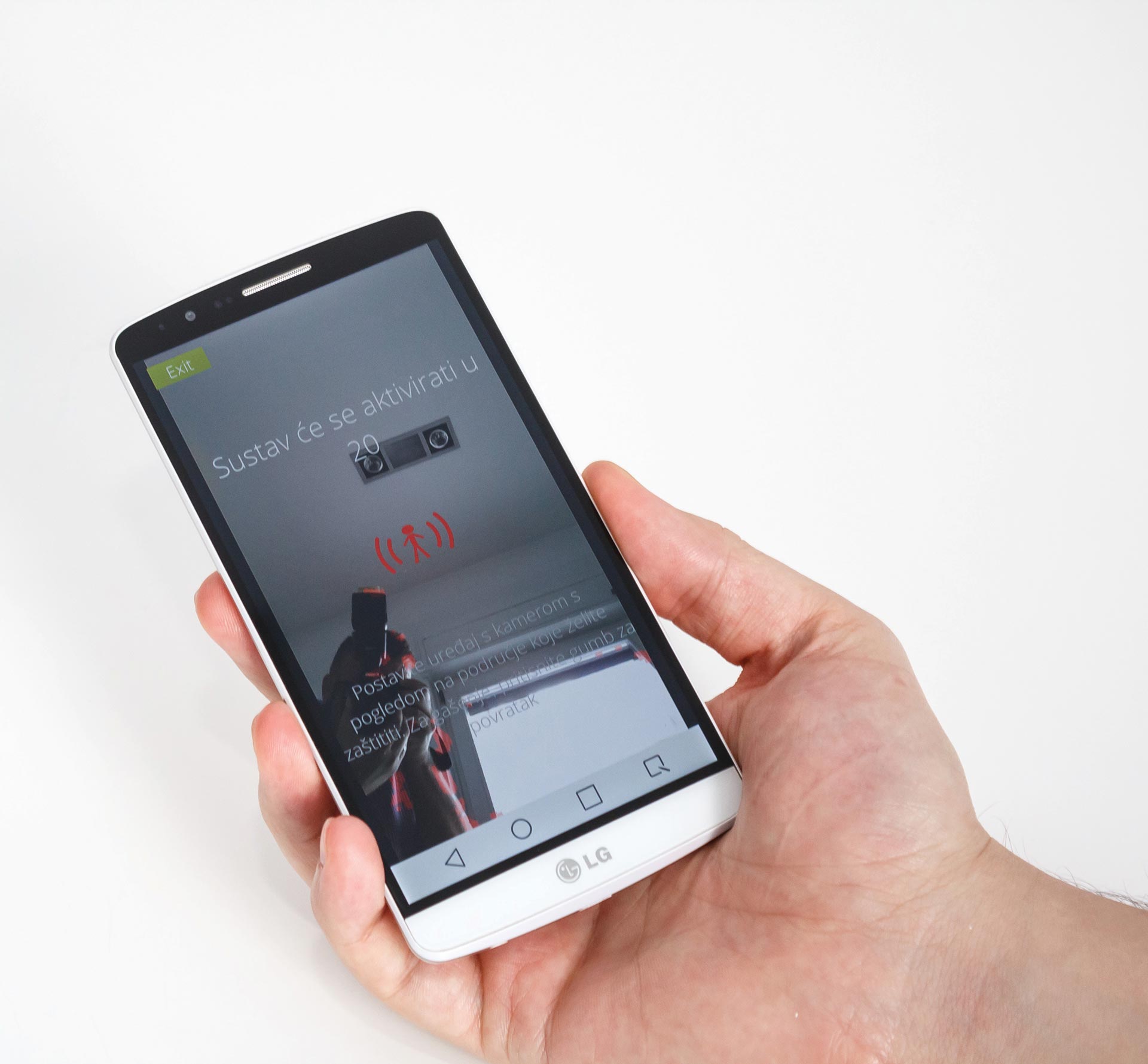 6. Sada se vratite u glavno sučelje, Android uređaj postavite na željeno mjesto i pritisnite veliki zeleni gumb. Time ćete pokrenuti Salient Eye, kojemu treba 20 sekundi da se “naoruža”. Imajte na umu doduše da je Salient Eye izuzetno osjetljiv te stoga nemojte stajati u blizini unutar tih 20 sekunda.