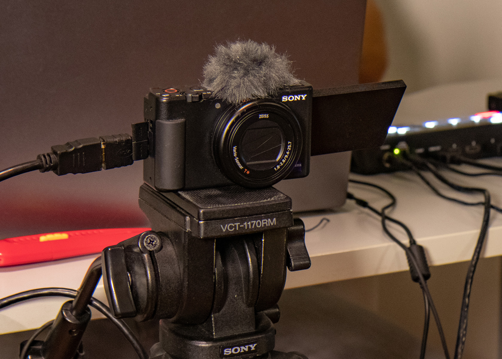 Za naš podcast studio odlučili smo se za setup od dviju kamera, pri čemu jedna snima široki kadar (oba sugovornika), dok je druga za gosta u našem studiju. Naše su kamere u nižem srednjem cjenovnom razredu, što znači da možete izabrati jeftinije i znatno skuplje i profesionalnije modele. Odlučili smo se za dva zanimljiva fotoaparata namijenjena vlogerima. Za glavnu smo kameru postavili Sony ZV-1 koja ima vrlo zanimljive vlog opcije poput praćenja lica i očiju uz konstantan fokus te napredan (pritiskom jedne tipke) bokeh efekt. ZV-1 ima veliki Exmor RS CMOS 1.0 senzor i može snimati u 4K rezoluciji.