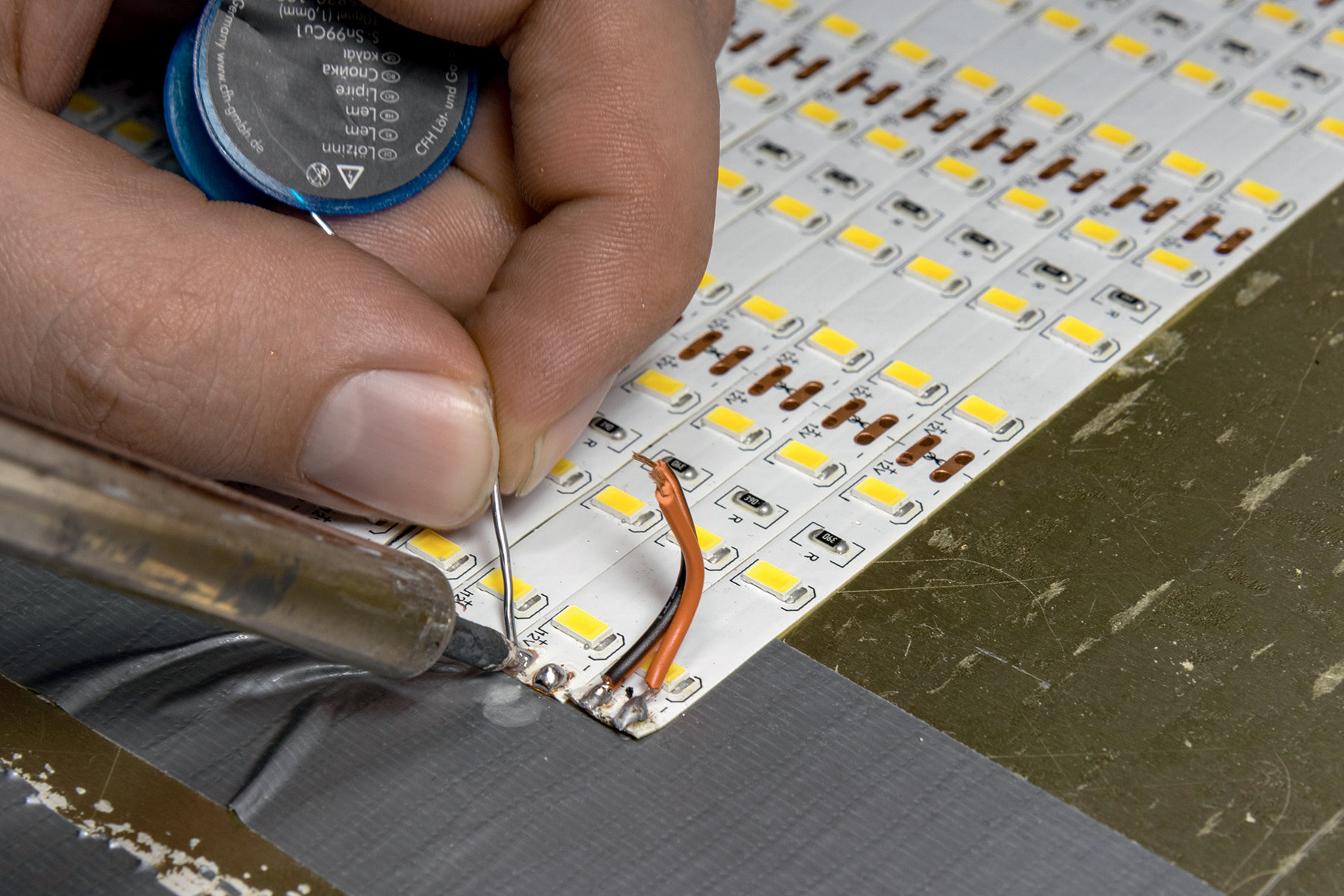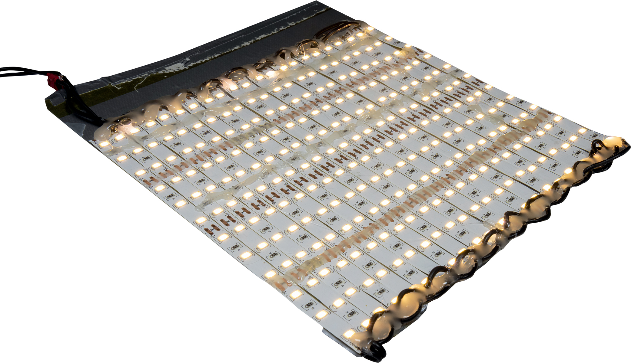 Zatim ih je potrebno sve zalijepiti, a ovakva rasvjeta ipak proizvodi nešto topline pa smo naš sustav stavili na limenu ploču jer ih čvrsto drži, a istovremeno bolje hladi. Kada su sve polijepljene, slijedi lemljenje. Jednostavno, svaka traka mora imati pristup izvoru struje, to jest spojen plus i minus. Uzmete dvije žice, izrežete ih na komadiće i lemite sve minuse na jednu žicu, a pluseve na drugu te ih spojite na kraju s izvorom napajanja od 12 V. Bitno je imati na umu da naš kvadrat LED-ica od 30x30 cm vuče do 5,5 A pri punoj snazi.