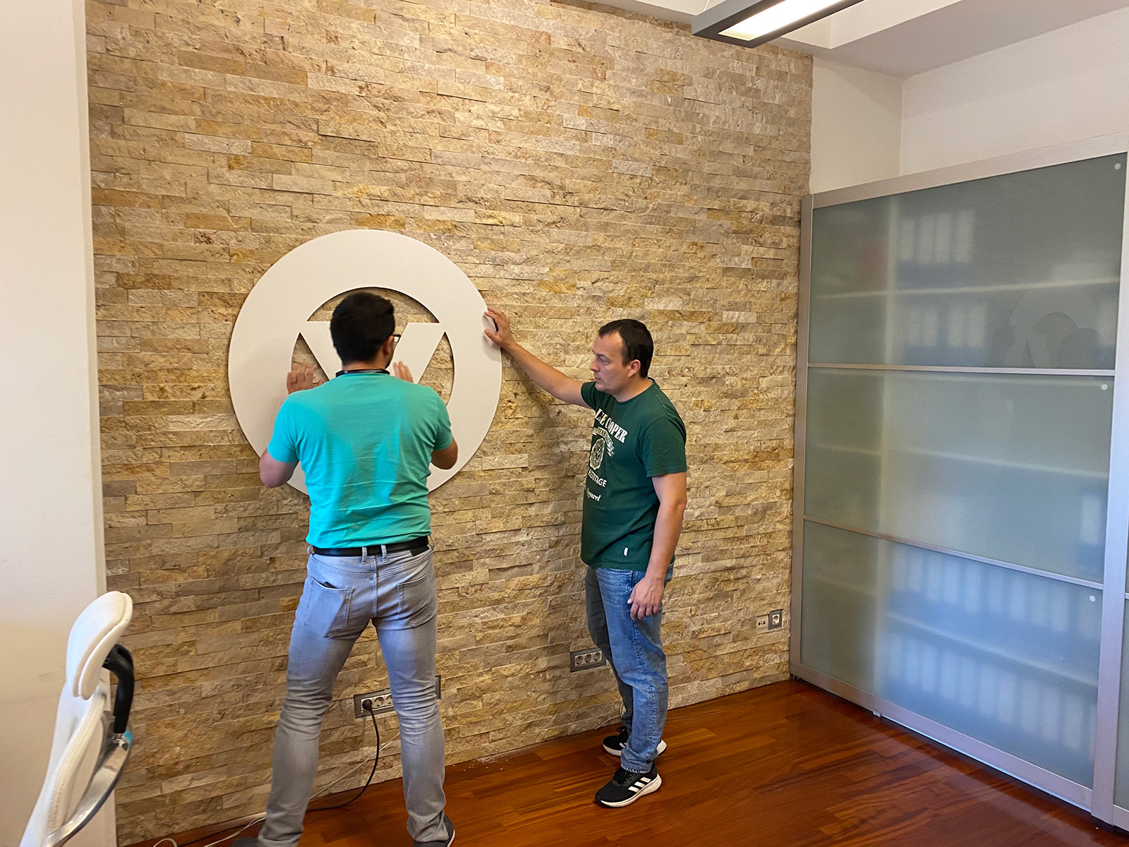 Prvo smo prostor očistili od stolova, fascikala i svih onih bitnih stavki koje je naša kolegica svaki dan koristila. Potom smo postavili ukrase i kulise u vidu željeznih konstrukcija, par detalja, našeg loga na zidu i trake s raznobojnom RGB rasvjetom kojom se može upravljati tako da budu razvučene po cijelom kadru.