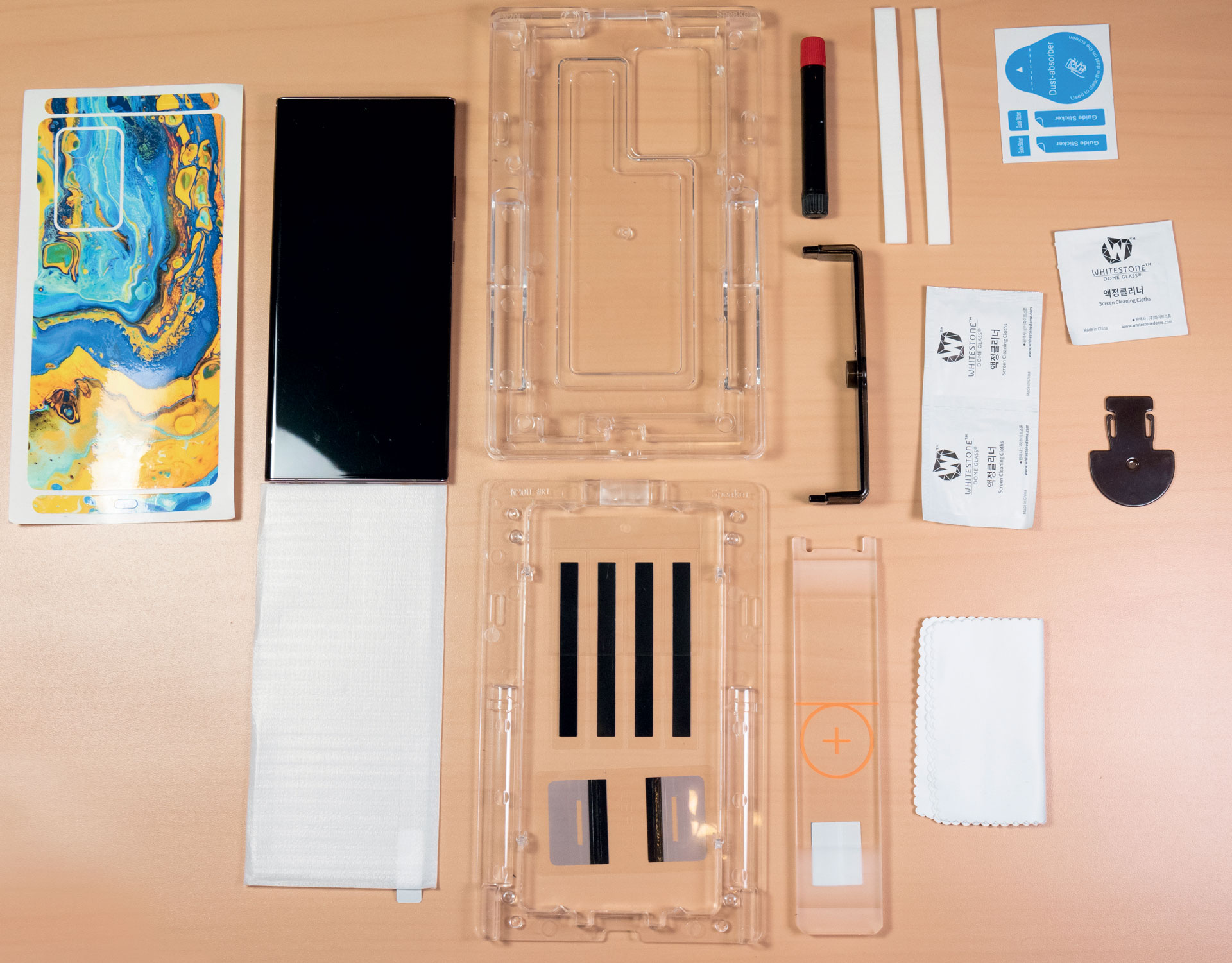 1.) Pogledajte što ste sve dobili: u pakiranju dobivate cijeli set za točno postavljanje na vaš uređaj, a bitno je da pri kupnji budete sigurni da je staklo baš za vaš model mobitela, jer osim stakla dobivate i držač mobitela načinjen specifično za svaki mobitel. Uz plastičnu ladicu u koju ide mobitel, dobivate i dosta drugih detalja koji će vam pomoći da nanesete ljepilo, te da sve postavite na točnu lokaciju kako bi konačan proizvod garantirano dobro ispao.