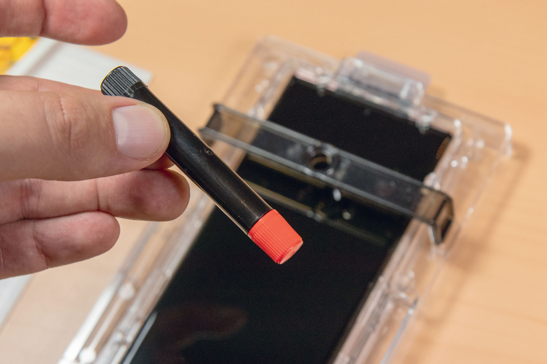 6.) Ovdje smo stavili plastičnu vodilicu s rupicom u sredini koja služi da točno stavite tubu s ljepilom na idealnu lokaciju po sredini stakla mobitela. Tuba ljepila ima dvije kapice, jednu sa svake strane, crvene i crne boje. Crvenu kapicu prvu skinite i otvorenu tubu stavite u sredinu vodilice iznad mobitela. Jednom kada je sve na mjestu, odvrnite gornju crnu kapicu i ljepilo će odmah iscuriti na zaslon mobitela. Dovoljno je rijetko da odmah sklizne s mobitela ako udarite u njega, pa je kod sljedećih par koraka bitno da budete mirni dok radite.