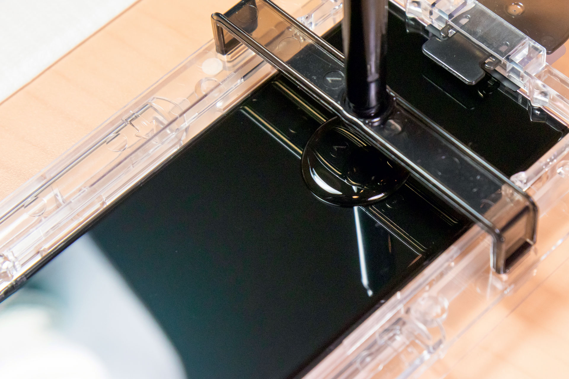 10.) Cijelu konstrukciju sada morate lagano nagnuti prema sebi kako bi ljepilo počelo putovati prema ciljniku nacrtanom na uteg. U jednom trenutku će dotaknuti zaštitno staklo te se početi širiti. Idealno bi bilo da taman pokrije krug ciljnika, te ne smije otići ispod crte. Jednom kada se većina ljepila nalazi unutar ciljnika, brzo maknite gornji plastični stoper kako bi se zaštitno staklo spustilo na mobitel i raširilo ljepilo po površini zaslona.