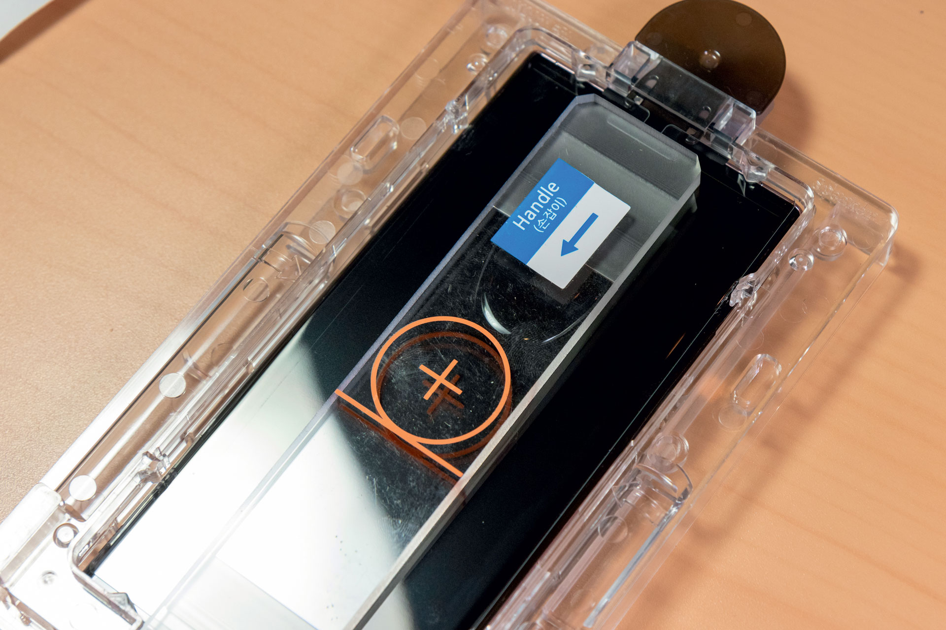 7.) Kod vrha mobitela, ako još niste, stavite malen plastični stoper koji se stavlja kroz samu ladicu i stoji malo iznad mobitela. Sada pažljivo maknite tubu s ljepilom, kao i vodilicu, kako biste mogli krenuti na sljedeći korak, a to je stavljanje samog zaštitnog stakla. Primijetit ćete da ladica oko rubova ima malene izbočine oko stakla mobitela, one služe da centriraju zaštitno staklo.