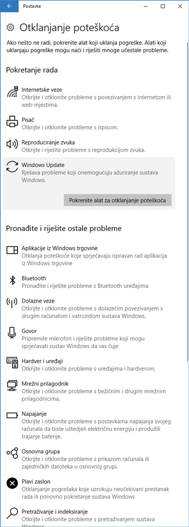 Dakle, kliknite na Start Menu, zatim na Postavke. Sada kliknite na Ažuriranje i sigurnost, zatim na Otklanjanje poteškoća. U narednom prozoru odaberite Windows Update prema svojim potrebama, no preporučamo da ovdje zavirite ako bilo što pođe po zlu prije nego posegnete za alternativnim metodama „oživljavanja” Windowsa 10.