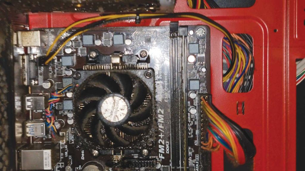 Nakon pažljivog pranja tekućim deterdžentom i destiliranom vodom dobro isperite komponente isključivo destiliranom vodom te dobro osušite komponenete. Ostane li vam nekakava malena kapljica vode na nekom ključnom kontaktu, računalo je izgubljeno zauvijek. Predlažemo da osuštite komponenete tako da ih uronite u kutiju s rižom na nekoliko dana koja će pomoći u izvlačenju vlage. Eventualno prije uranjanja u rižu, ispušite vodu iz utora za RAM i sl. jer bi se tamo voda mogla duže zadržati. Provjerite i mekanim papirom ili ubrusima, ima li još vode po raznim utorima.