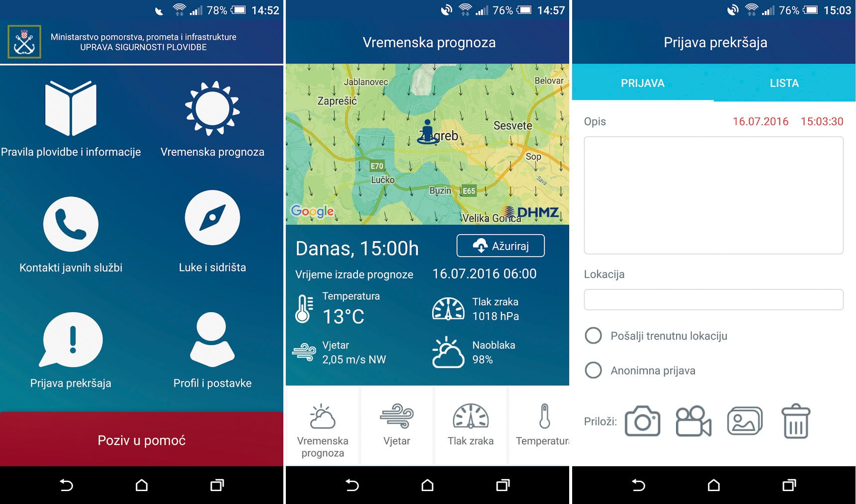 Ona na sebi osim brojnih korisnih informacija i detaljnih vremenskih prognoza, ima mogućnost slanja poziva u pomoć s lokacijom na pritisak jednog gumba. Istovremeno dok se spajate na Službu traganja i spašavanja na moru kojoj možete pristupiti i putem poziva na broj 195, šaljete podatke o svojoj lokaciji.