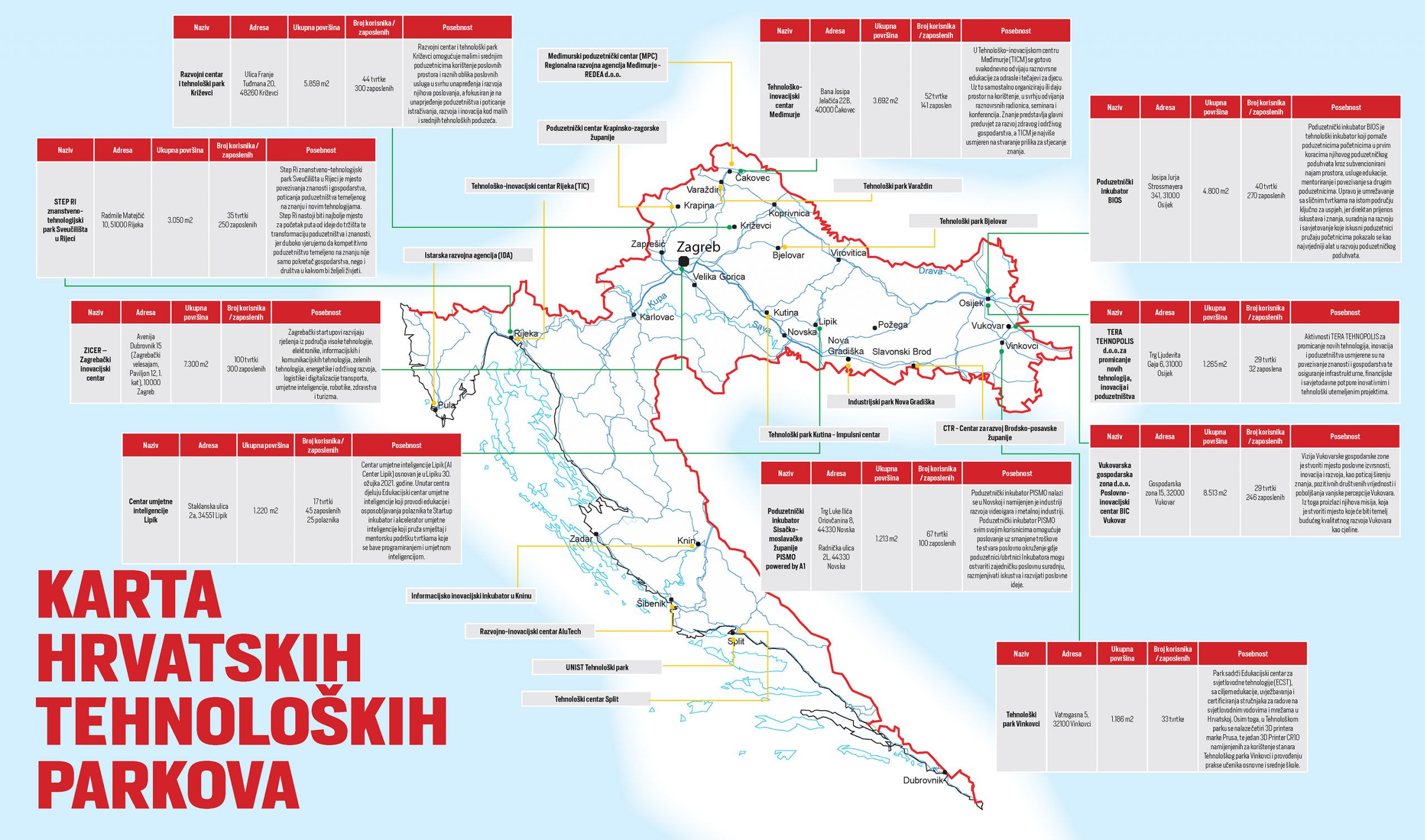 Cijelu kartu tehnoloških parkova i poduzetničkih inkubatora u Hrvatskoj možete pogledati dolje ili ju otvoriti u punoj veličini klikom na ovaj link.