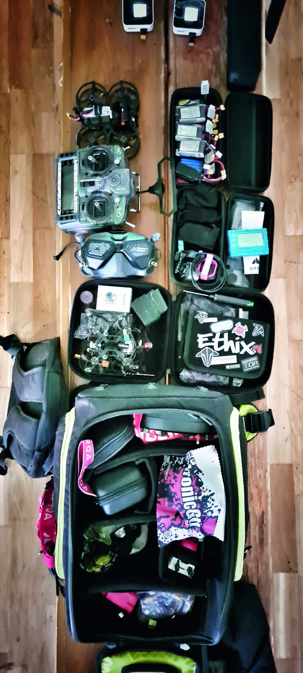 Na trening FPV ekipa nosi raznovrsne dronove za sve prigode letenja, od 2 inča do većih long-range dronova od 7 inča. Nosi se sve što može letjeti, a da uz sebe ima i dovoljno baterija.
