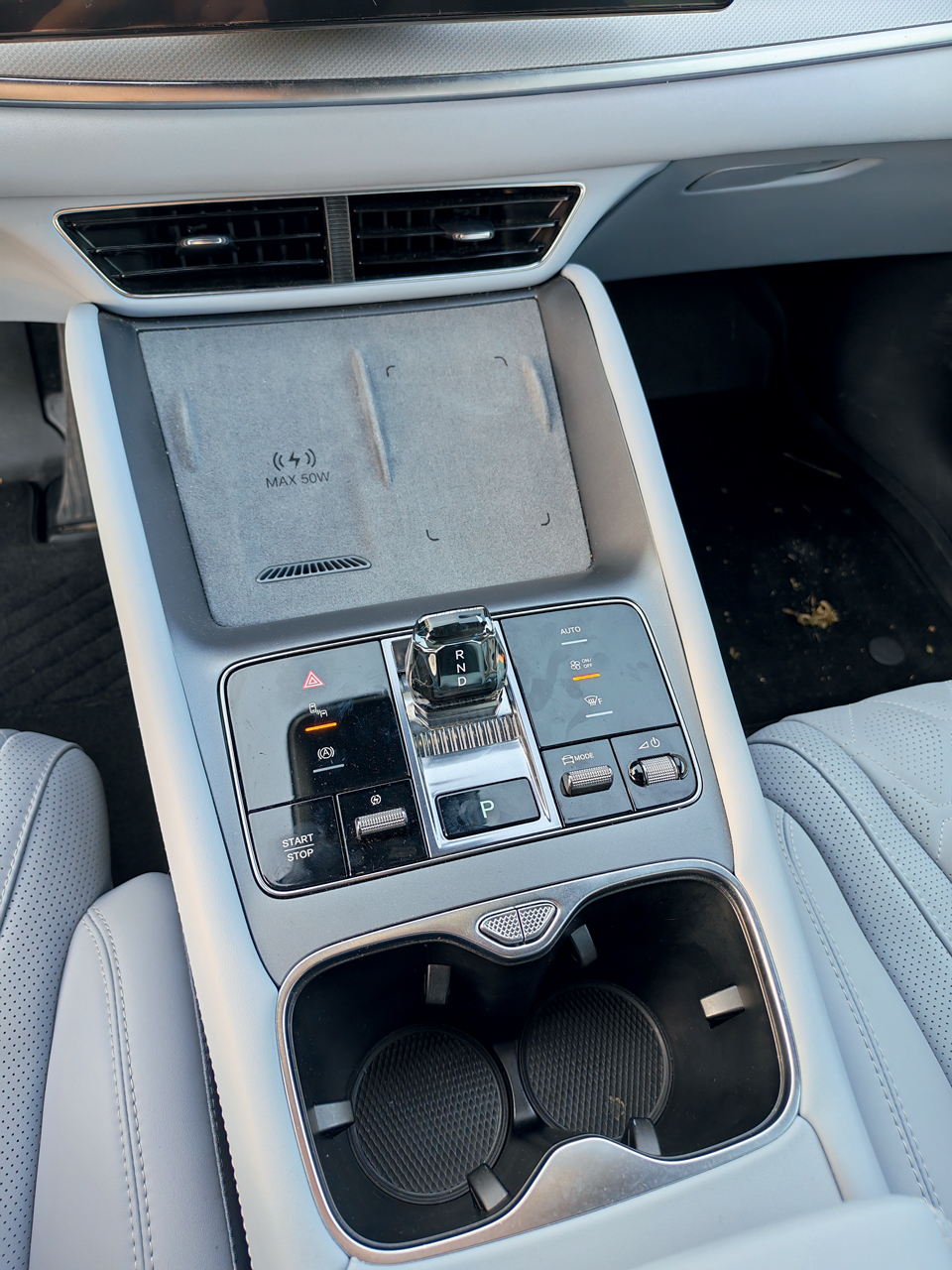 Krenimo redom. Putem infotainmenta upravljate Dynaudio zvučnim sustavom s 12 zvučnika i klimatizacijom koja uključuje sve standardne mogućnosti uz dodatak grijanja kola upravljača, grijanja i hlađenja prednjih sjedala te grijanja stražnjeg reda sjedala, što je uvijek vrlo pozitivno za vidjeti. Dodajmo pritom da se većina kontrola obavlja putem zaslona, uz iznimke kao što je maksimalna snaga ventilacije prema prednjem vjetrobranskom staklu za odmagljivanje. Tipka za tu opciju nalazi se desno od jednostavnog automatskog mjenjača. Glavne funkcije kao što su podizanje i spuštanje temperature može se obaviti pritiskom na zaslonu ili istovremenim pokretom tri prsta preko ekrana u određenom smjeru.