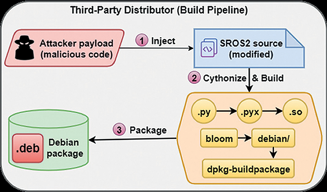 Primjeri ugrađivanja malicioznog paketa pomoću ranjivosti dobavnog lanca. Napadač se ugrađuje u proces izrade softverskih biblioteka i kasnije se direktno ugrađuje u operativno sustav – ROS Izvor: https://www.researchgate.net/figure/Build-pipeline-for-a-malicious-SROS-2-Debian-package-at-a-thirdparty-distributor_fig1_397231318