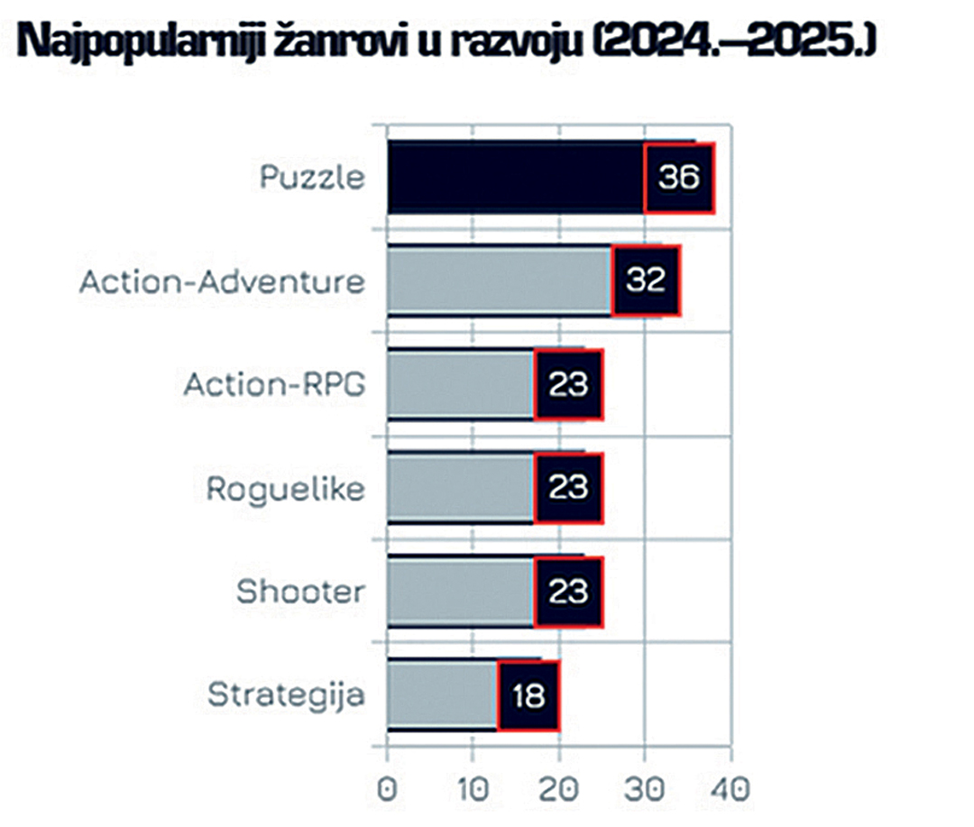 Udio domaćih studija koji razvijaju videoigre, poredan po najčešćim žanrovima
