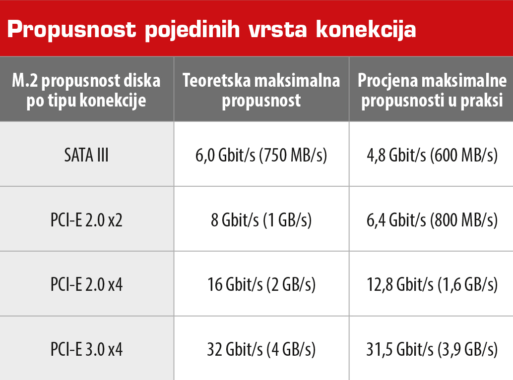 Neki od jeftinijih modela prijenosnika čak i dolaze s praznim M.2 slotom, tako da ga proizvoljno možete nadograditi. Istina da nema puno modela M.2 SSD-ova, pogotovo na našem tržištu, ali ih je zato sve više i sve su zapaženiji (gotovo svaka novija desktop matična ploča ga ima), pa nam se tako njegova budućnost čini dosta svijetlom, te je već i ovakav bolji i rašireniji od mSATA standarda. Jedan od razloga zašto su ga proizvođači zavoljeli jest činjenica da može koristiti SATA ili PCI-express sučelje za ostvarivanje propusnosti. U većini slučajeva i u novijim verzijama riječ je podršci za PCI-express 3.0 x4 sučelje koje mu omogućava do 4 GB/s, što je daleko više nego kod potencijalnoga nasljednika SATA konekcije, SATA Express, a kamoli tek klasičnoga SATA III priključka.