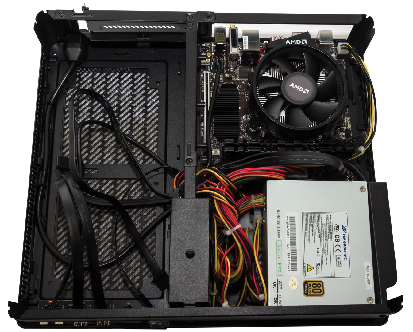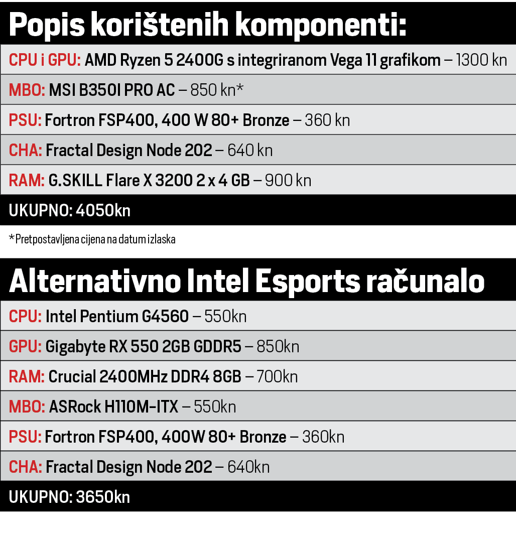Nakon dugog razmišljanja odlučili smo se na Fractal Design Node 202, Fractalovo Mini-ITX kućište koje slijedi njegov već poznati hladni industrijski dizajn i vrhunsku kvalitetu izrade. Fractalova kućišta također imaju i veliku modding zajednicu, tako da ćete, ako se odlučite za modifikacije ili vam zatrebaju zamjenski dijelovi, sve lako pronaći online. Node 202 podržava velike grafičke kartice duljine od čak 310 milimetara, što znači da ćete u svoj build moći staviti gotovo sve kartice na tržištu ako se jednog dana odlučite za nadogradnju. Termalne performanse Fractala Node 202 odlične su zbog perforiranih otvora na strateškim mjestima: iznad hladnjaka procesora i iznad prostora za grafičku karticu. Podrška je za ventilatore odlična za kućište ih dimenzija, a ono podržava dva 120-milimetarska ventilatora koji se instaliraju unutar prostora za grafičku karticu. Podrška za hladnjake ograničena je dubinom kućišta od svega 82 milimetra, tako da u Node 202 možete instalirati hladnjak maksimalne visine 56 milimetara. Odlučili smo zadržati AMD-ov stock Wraith Stealth hladnjak jer odgovara dimenzijama te nudi dobre performanse hlađenja uz nisku razinu buke. Drugo ograničenje Nodea 202 podrška je za napajanje jer podržava samo napajanja SFX formata. Odabrali smo Fortronovo FSP400 napajanje snage 400 W s 80+ Bronze certifikatom efikasnosti zbog njegova odličnog omjera cijene i performansi te mogućnosti nadograđivanja našeg builda zasebnom grafičkom karticom srednjeg segmenta u budućnosti. Matičnu ploču i memoriju dobivenu u press kitu koji nam je AMD poslao odlučili smo zadržati u ovom buildu jer zadovoljavaju njegove kriterije. Matična je ploča MSI B350I PRO AC i radi se o ploči Mini-ITX formata, što je glavni kriterij pri izboru za ovaj build. Drugi je kriterij podrška brze memorije zbog ovisnosti integrirane Vega 11 grafike o brzoj memoriji, što ova ploča također zadovoljava. Radna je memorija G.SKILL Flare X radnog takta 3200 MHz ukupnog kapaciteta 16 GB u konfiguraciji dvaju modula od 8 GB te zadovoljava kriterije brzine i količine memorije za ovaj build. Jedina mana ove memorije njena je iznimno visoka cijena, pa predlažemo da razmislite o kupnji samo jednog modula od 8 GB uz kasniju nadogradnju na 16 GB memorije u slučaju da se odlučite replicirati naš prijenosni eSports build.