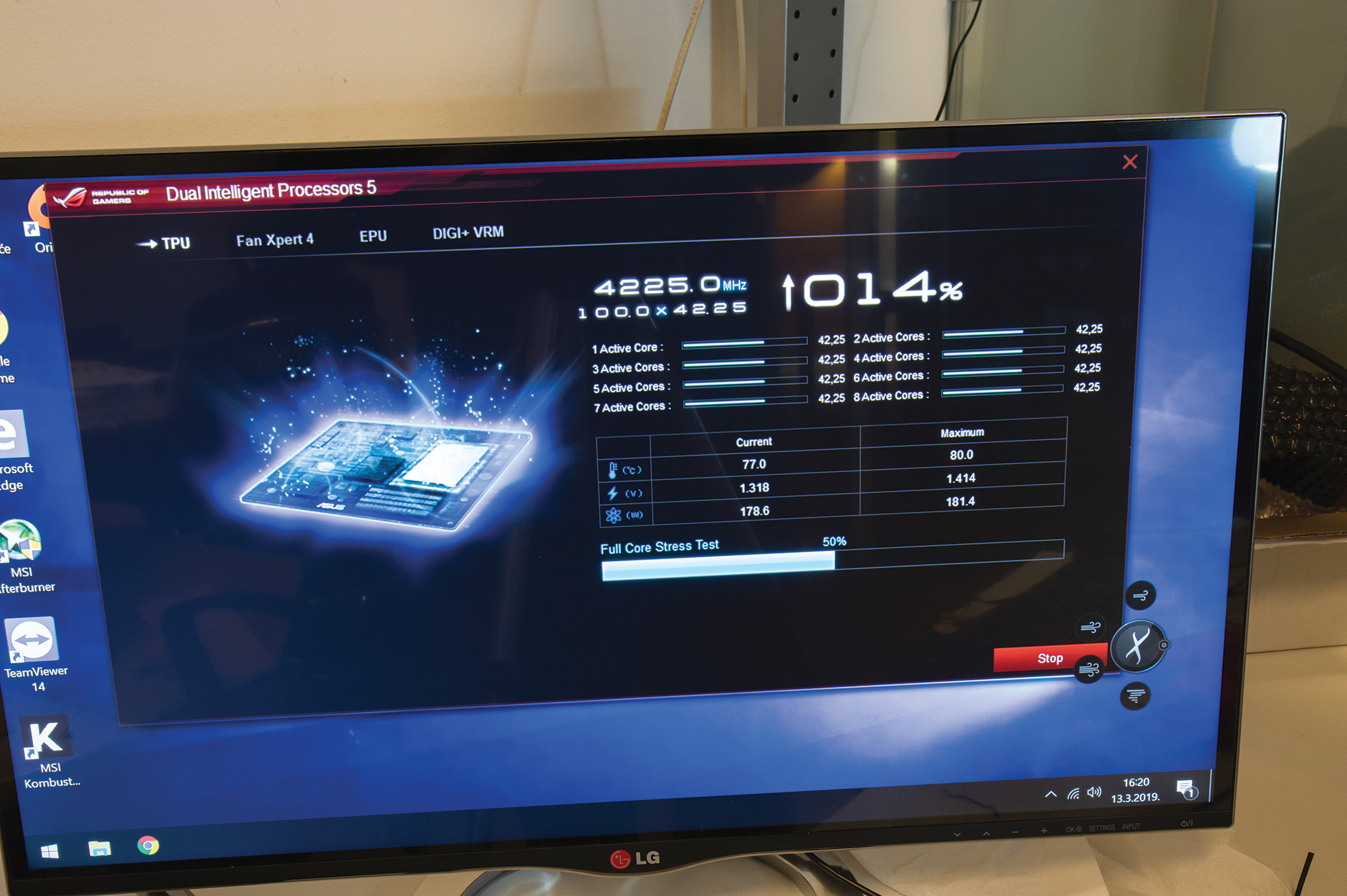 1,4 V smatramo sigurnom maksimumom te smo pogledali koliko još možemo spustiti voltažu. Stabilan minimum našao se oko 1,375 V, što je na stres-testu spustilo temperaturu s 87 °C na 74 °C, što je svakako značajno. Ostavljanjem voltaže malo iznad 1,4 V lagano dižemo brzinu procesora i na 4,3 GHz.