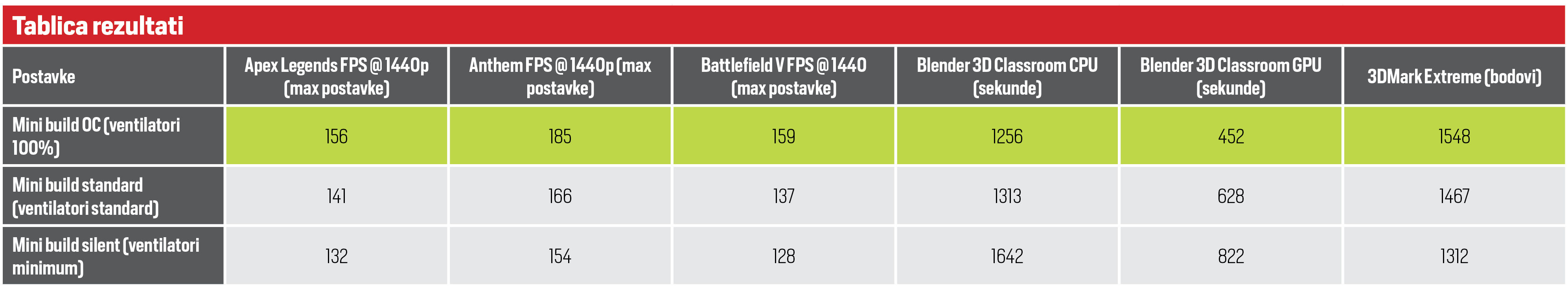 Nakon obligatornog instaliranja Windowsa isprobali smo kako ovaj malac gejma. Nakon nebrojenih sati u novim naslovima kao što su Apex: Legends, Anthem i Battlefield V došli smo do zaključka da nema vidljivih razlika u performansama između builda u velikom kućištu i našeg mini čudovišta.