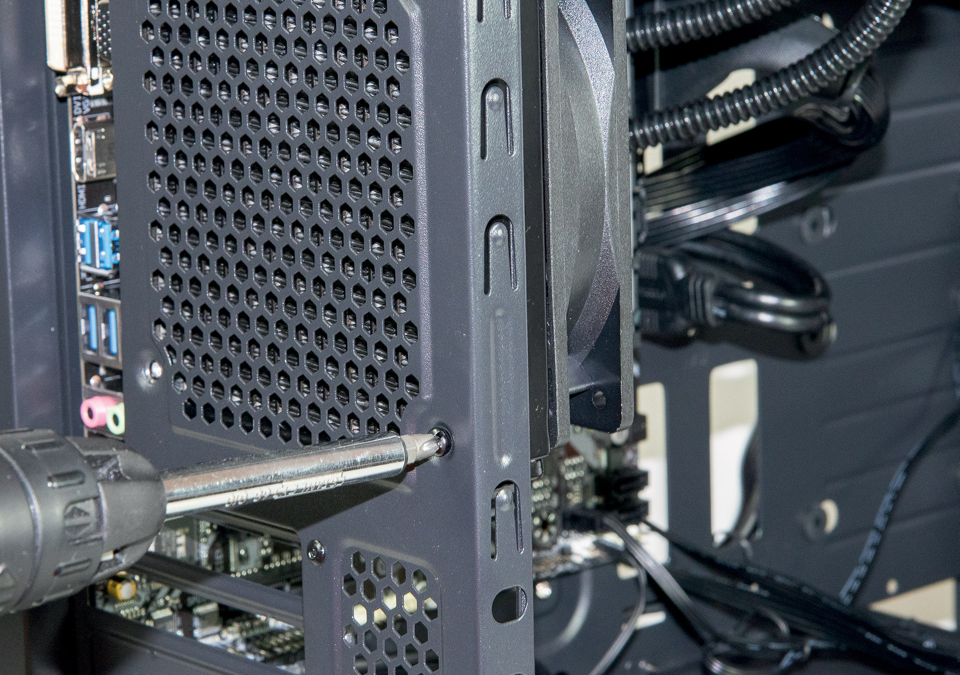 Ovisno o izboru kućišta ovaj korak može biti izrazito jednostavan ili vrlo kompliciran. U najgorem slučaju potrebno je ukloniti sve tvornički ugrađene ventilatore i zamijeniti ih boljim ventilatorima ili im promijeniti položaj. U našem slučaju Antec je napravio većinu posla i sve što smo mi morali napraviti je ukloniti stražnji 120mm ventilator kako bismo napravili mjesta za radijator vodenog hlađenja. Tvornički položaj prednjeg 140mm ventilatora je savršen za maksimalne performanse, stoga mu nismo mijenjali položaj.