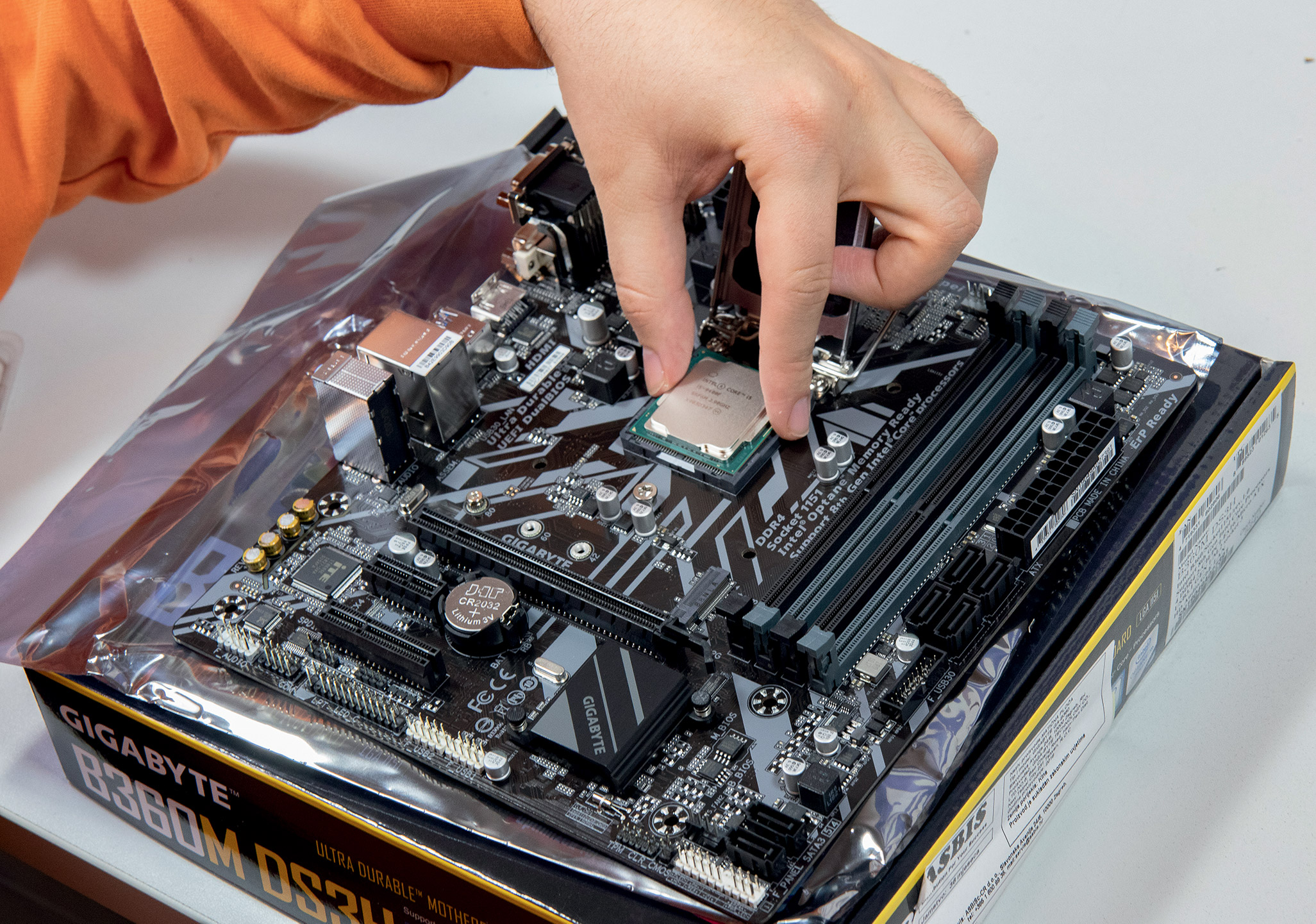 Ovo je jedan od najjednostavnijih, ali i najriskantnijih koraka u gradnji računala. Iskusni graditelji će reći kako je vrlo jednostavno ugraditi procesor - poravnate trokut na procesoru s trokutom na ploči i ubacite procesor u socket. Iako zvuči jednostavno, socket je vrlo osjetljiv jer sadrži preko tisuću (u našem slučaju 1151) malih nožica koje je vrlo lako saviti i ploču pretvoriti u uteg za papir. Uzmite si vremena i polako spustite procesor u socket te ga lagano pomaknite par puta da se uvjerite kako je procesor pravilno sjeo u socket. Sve što je preostalo jest da spustite pokrov socketa i time osigurate procesor.