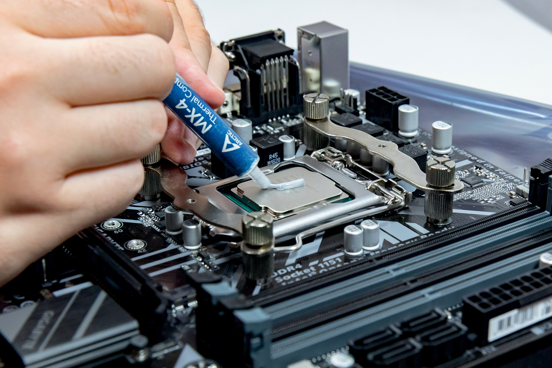 Budući da coldplate hladnjaka i površina heatspreadera nisu u potpunosti ravne, između njih je potrebno staviti medij koji popunjava praznine, odnosno termalnu pastu. Iako naš hladnjak dolazi s malim pakiranjem termalne paste, odlučili smo koristiti Arctic MX-4 pastu koja ima odličnu termalnu vodljivost i nisku cijenu. Aplicirali smo pastu u kratkoj liniji, malo većoj od zrna riže, kako bismo pokrili cijelu površinu heatspreadera procesora.