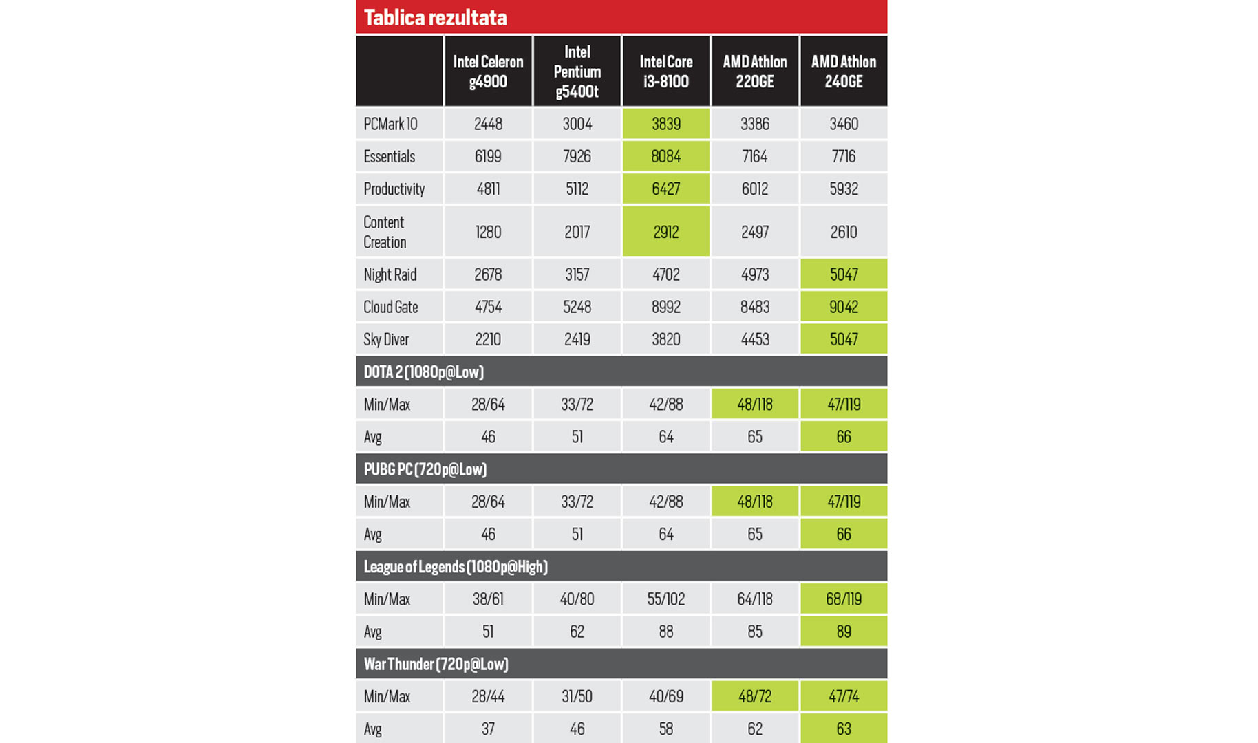 War Thunder je zadnji naslov koji smo probali, a njihov veliki izbor gaming modova, kao i vrhunska grafika (ako ju možete pokrenuti) mami igrače, zajedno s činjenicom da je F2P naslov. Nažalost, pokazao se malo prekompliciran za većinu naših procesora te se tako letenje svelo na 720p “low” kvalitetu, što nikome neće biti previše zabavno, pogotovo pod tridesetak fps-a koliko dobivate s Celeron g4900 procesorom. Pentium fps diže na “igrivih” četrdeset fps-a, no ta cifra će varirati ovisno o modu i zbivanjima na ekranu. I3 8100 napokon pod niskim postavkama i 720p omogućuje igranje od oko 60 fps-a, no igra neće vizualno biti previše atraktivna. Athloni 220GE i 240GE jako su blizu međusobno, no bez problema drže korak s i3 procesorom s oko 60 fps-a, ovisno o modu igre i sadržaju na ekranu. Overclock procesora daje dodatan boost, što definitivno stavlja procesore u vodstvo nad Intel konkurencijom.