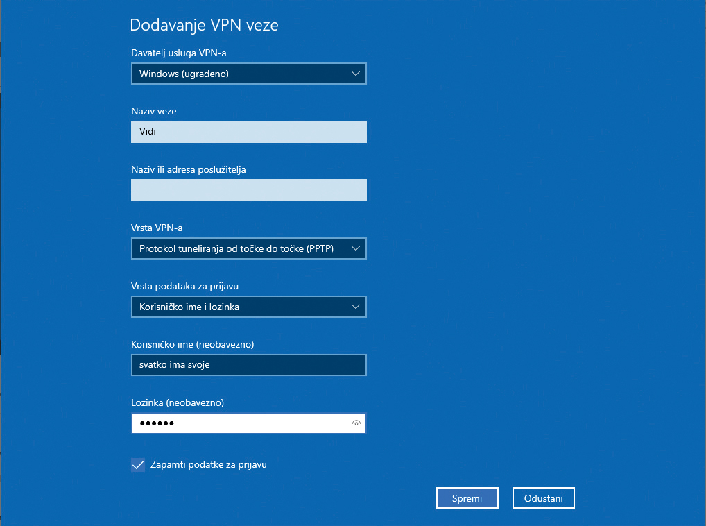 Ovdje je potrebno popuniti polja kako ste dobili podatke od vašeg routera ili od nekog drugog davatelja VPN usluge: